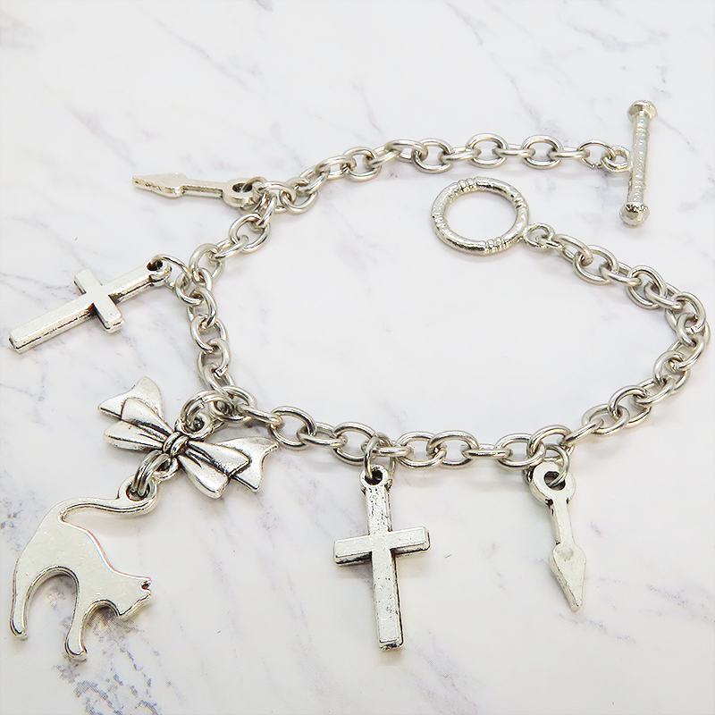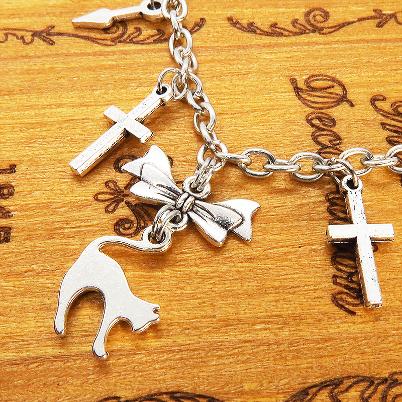 猫、リボン、ロザリオ、時計の針という、異なるモチーフを組み合わせた、華やかで物語性のあるブレスレット
