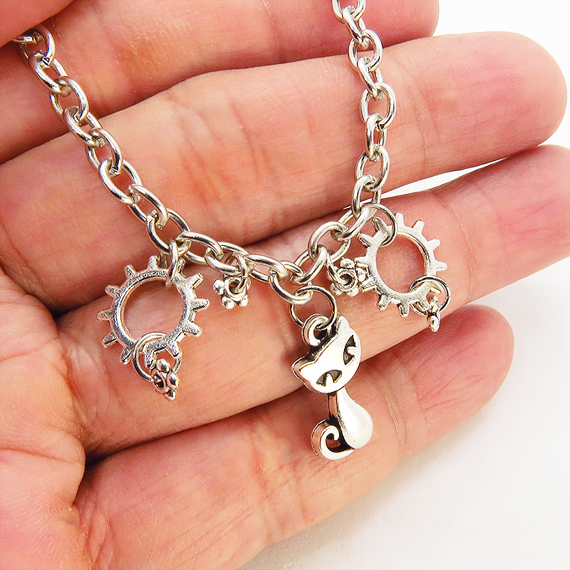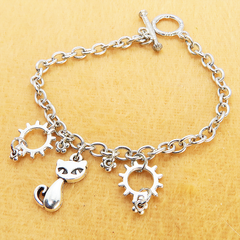 手首に宿る、機械仕掛けの猫。シルバーカラーの歯車ブレスレット