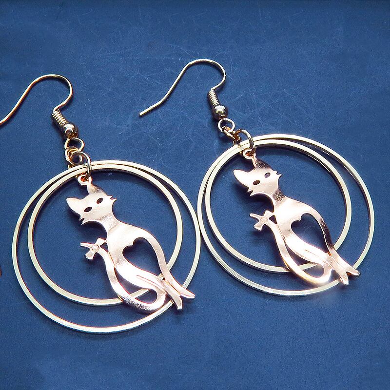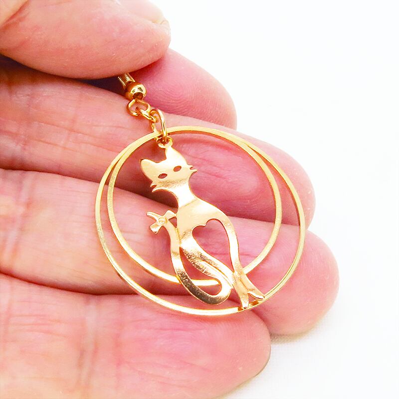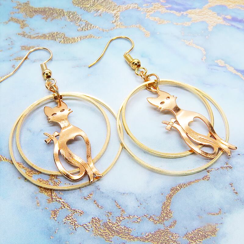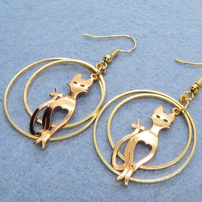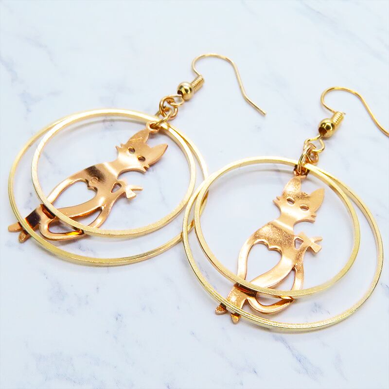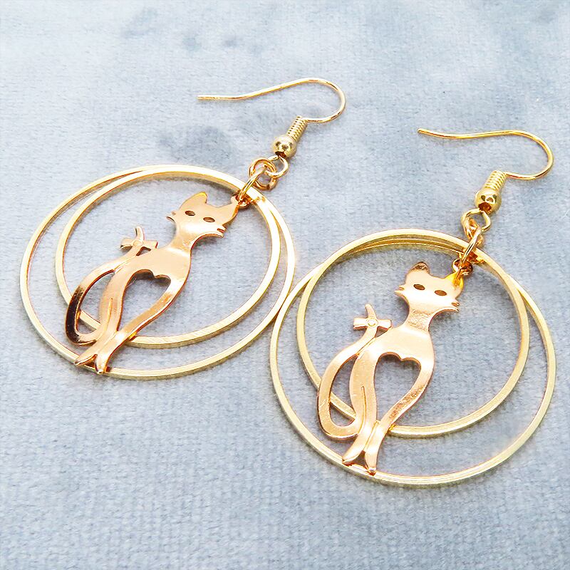 耳元で揺れる、上品な猫のシルエット。マットゴールドダブルリングピアス
