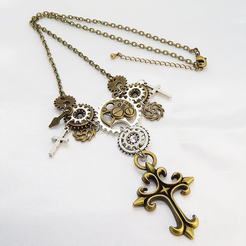 胸元に刻む、ゴシックとメカニズム。アンティークゴールドとシルバーの歯車とロザリオネックレス