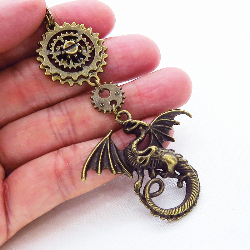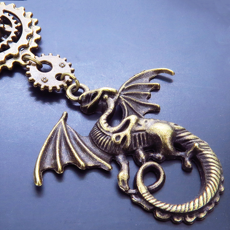 翼を広げ、力強く天を舞うドラゴンの勇姿と精巧に組み合わされた歯車のメカニカルな美しさが融合したスチームパンク風のデザイン