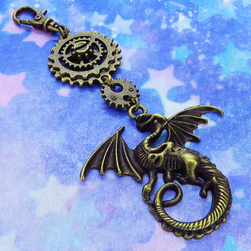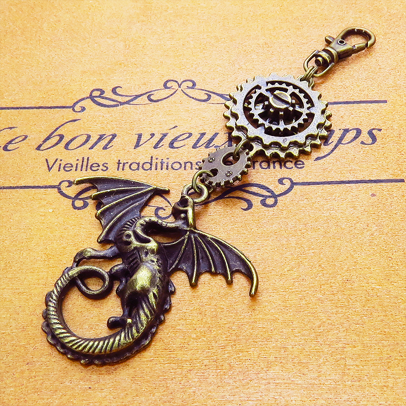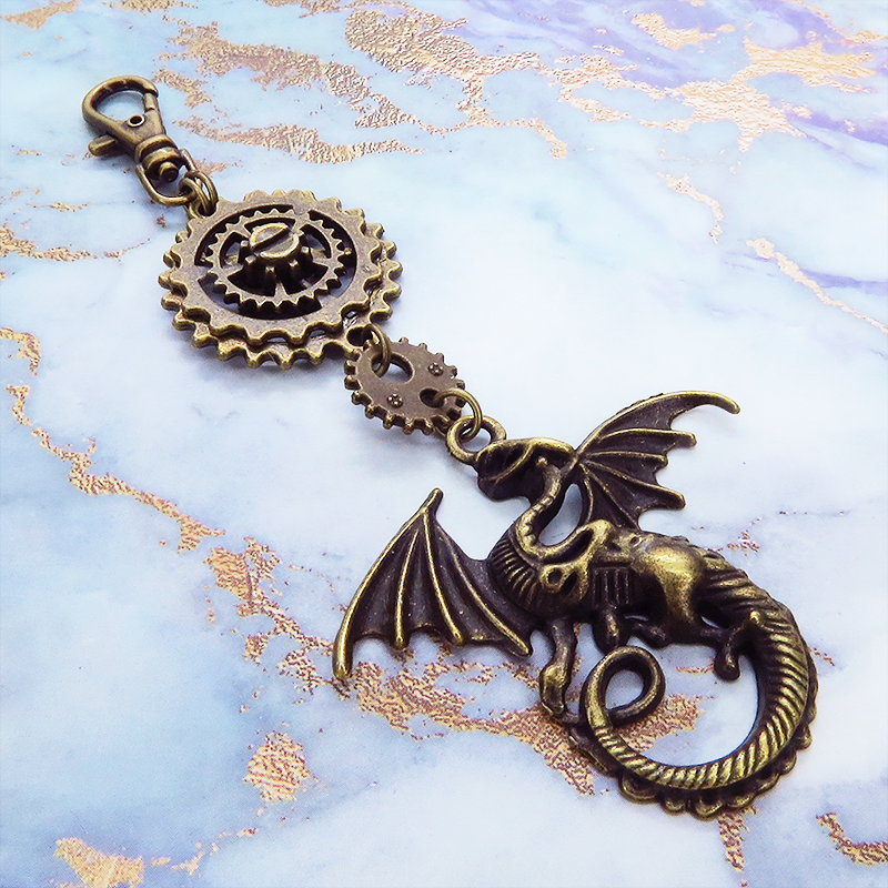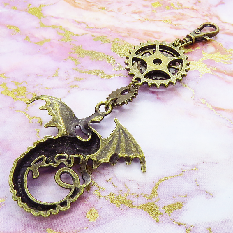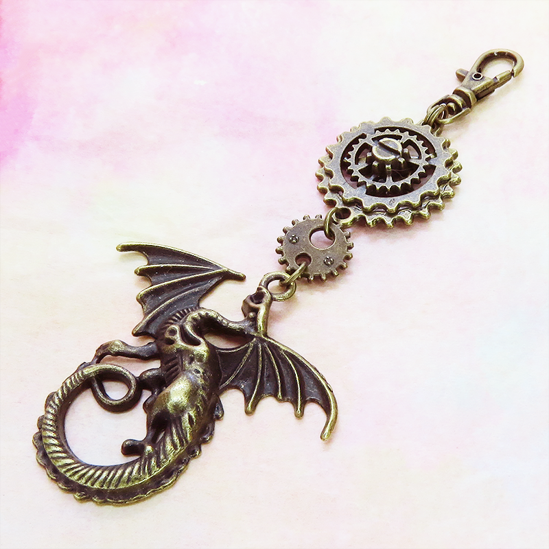 翼を広げ、時を翔ける。アンティークゴールドのドラゴンと歯車キーホルダー