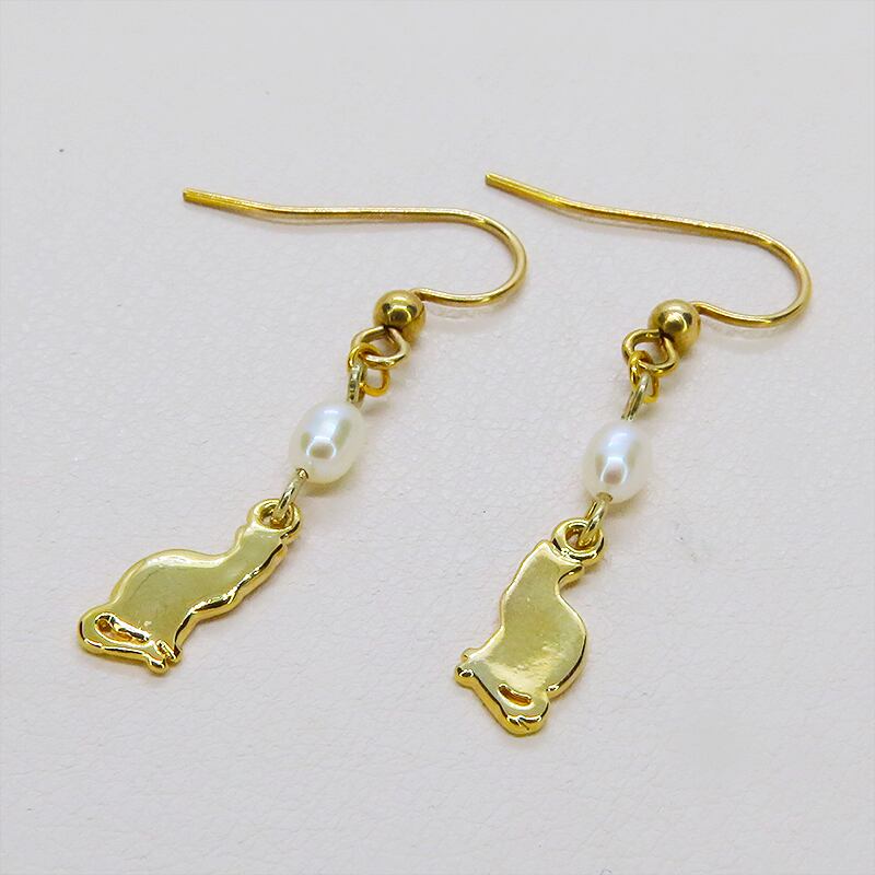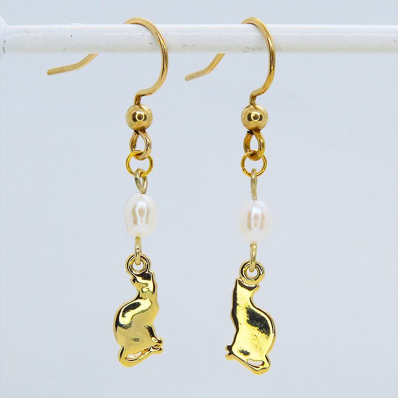 耳元で優雅に揺れる、金の猫と真珠の囁き。14KGFピアス