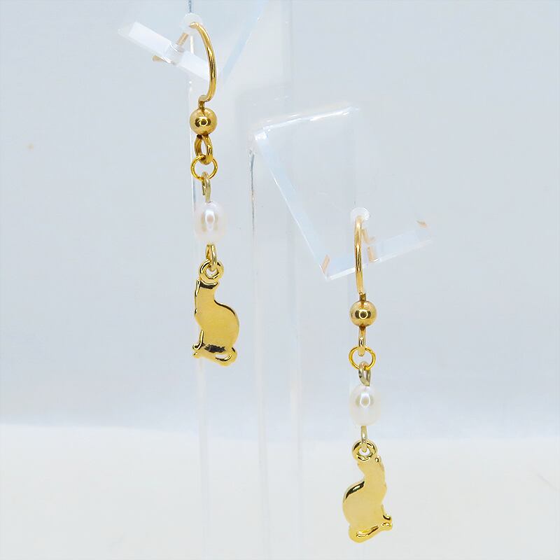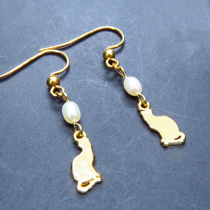 艶やかな金色に浮かび上がる愛らしい猫のシルエットと上品な光沢を放つ淡水パールが耳元で優雅に揺らめきます