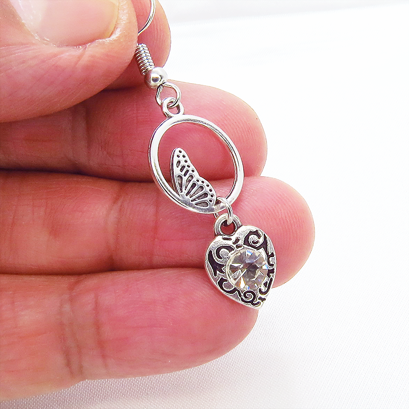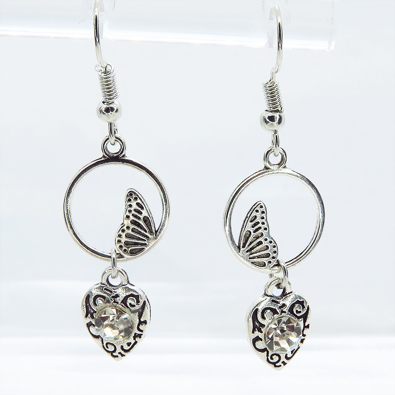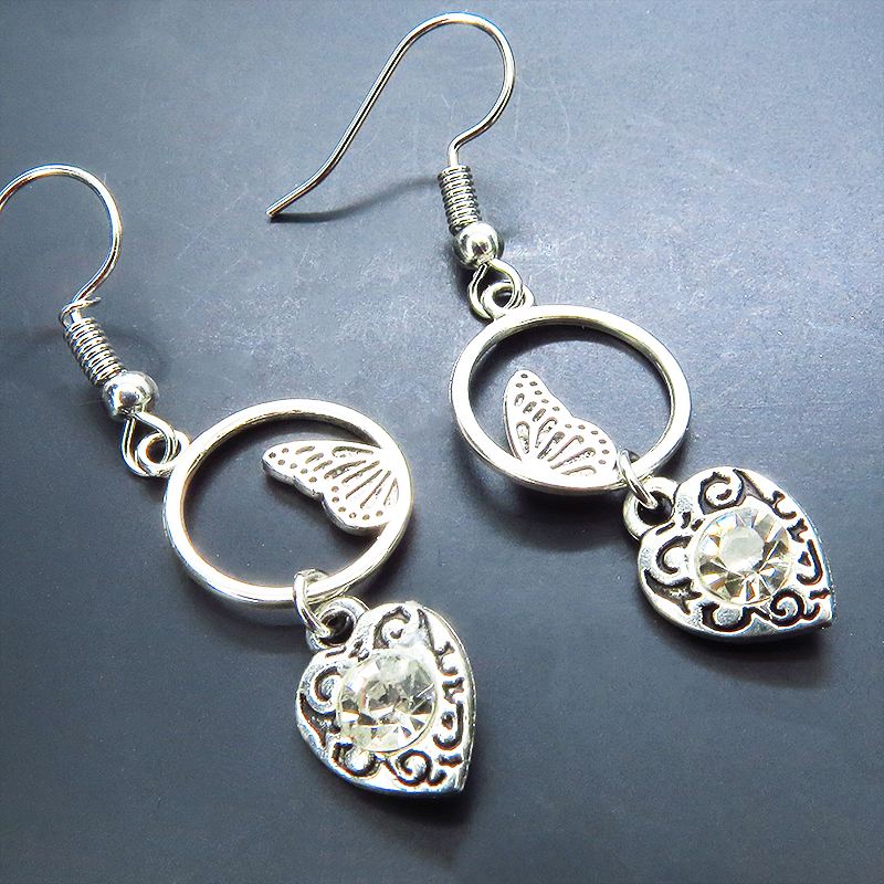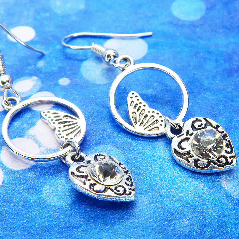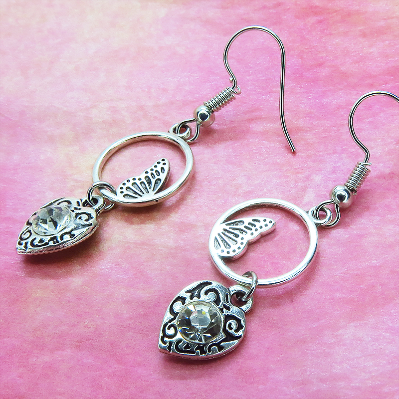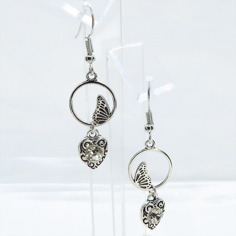 ハートモチーフの上で揺れるのは蝶の羽をかたどった繊細なモチーフ