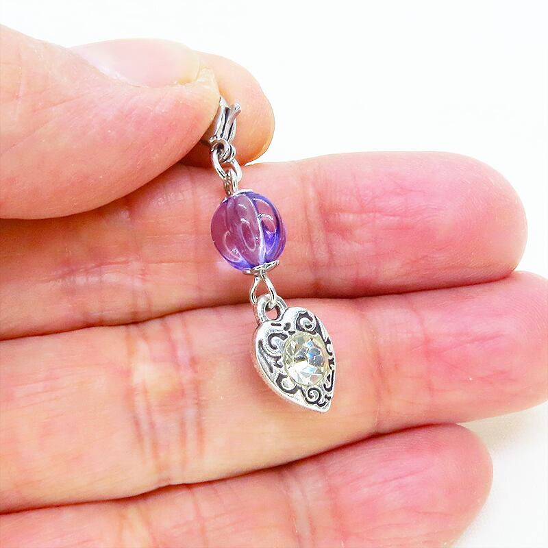 ハートモチーフの上には深みのあるバイオレットカラーのビーズが配置され上品な彩りを添えます