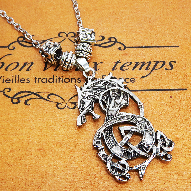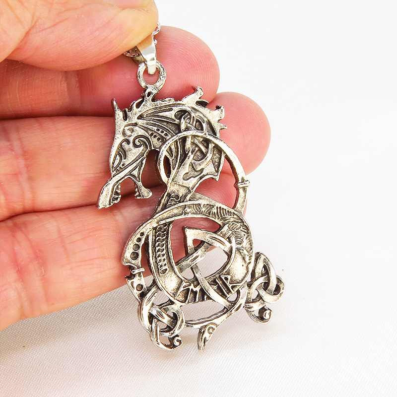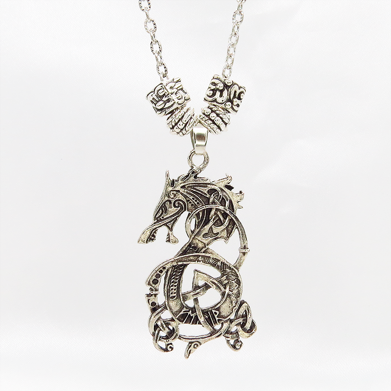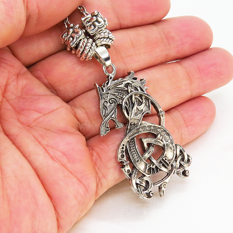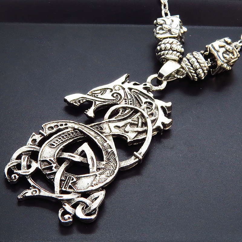 中世のバイキングを彷彿とさせる、力強い龍の姿が、胸元に圧倒的な存在感を放ちます