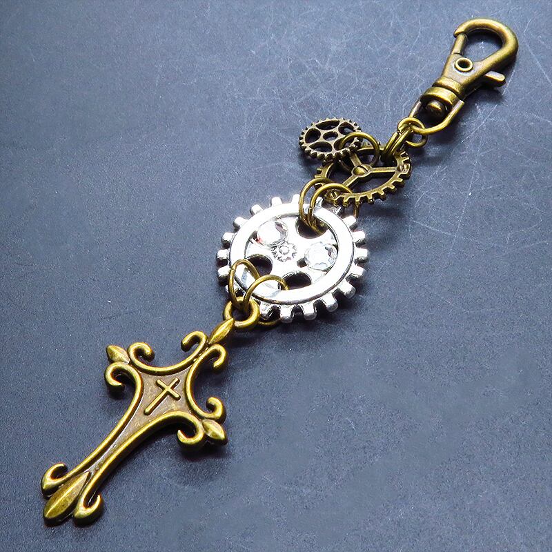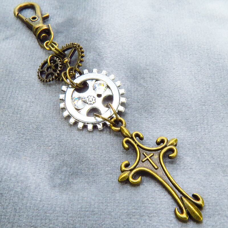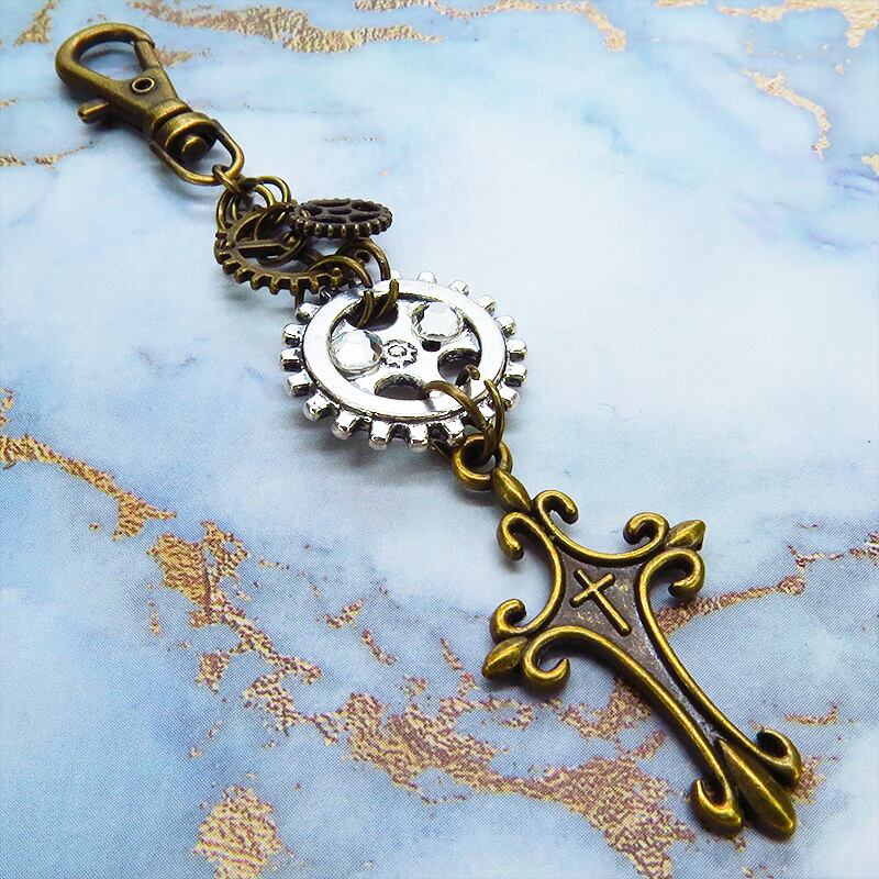 アンティークゴールドのシックな輝きをベースに、ゴシックなロザリオと複雑に絡み合う歯車が、スチームパンクの独特な世界観を表現したキーホルダーです