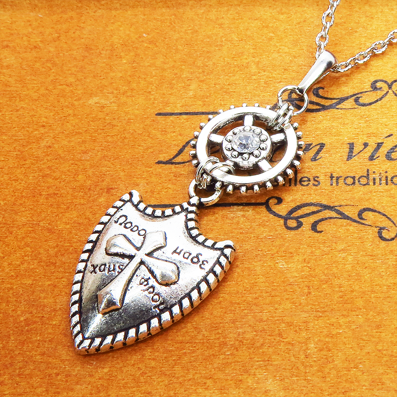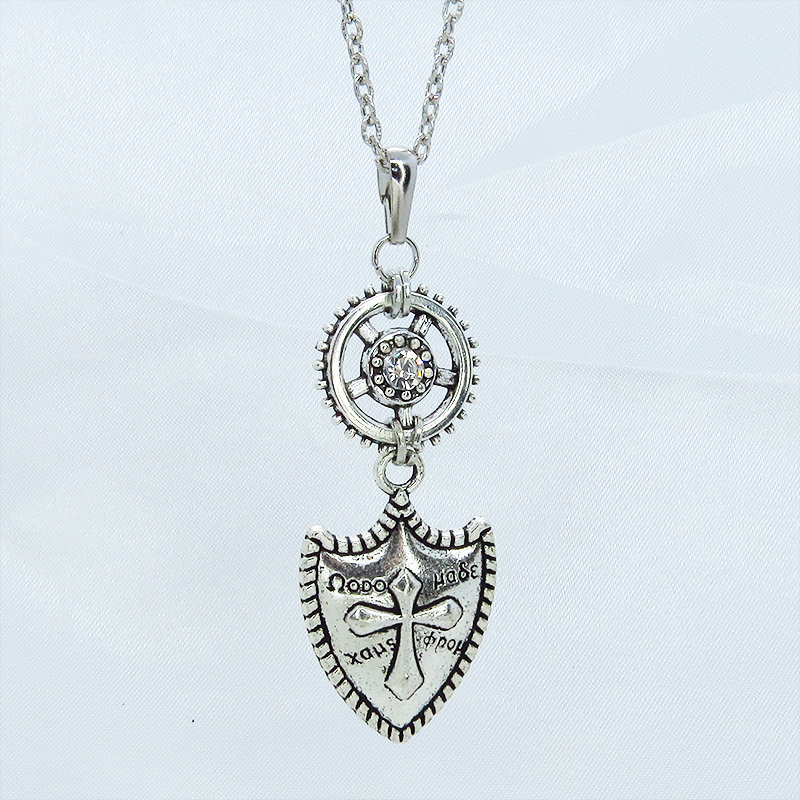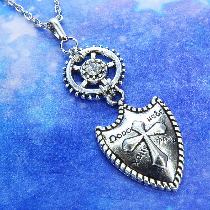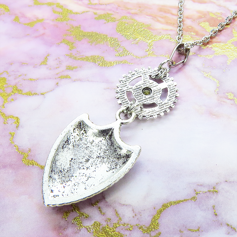 ペンダントトップは重厚感のある盾のモチーフとメカニカルな歯車が独創的なハーモニーを奏でています