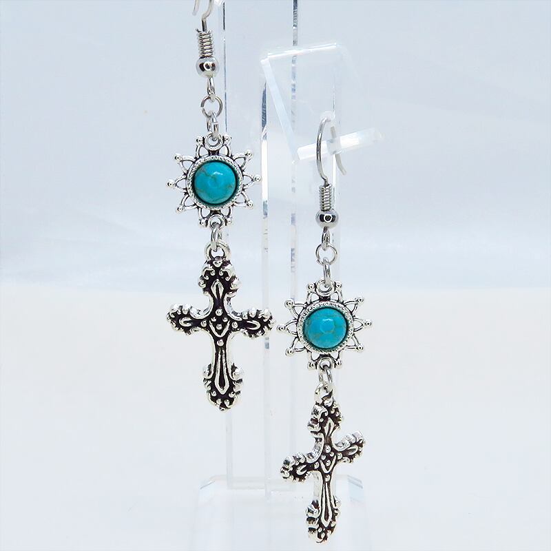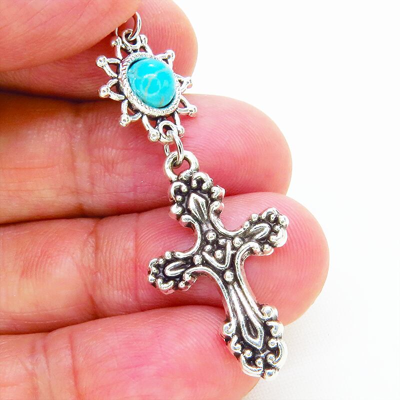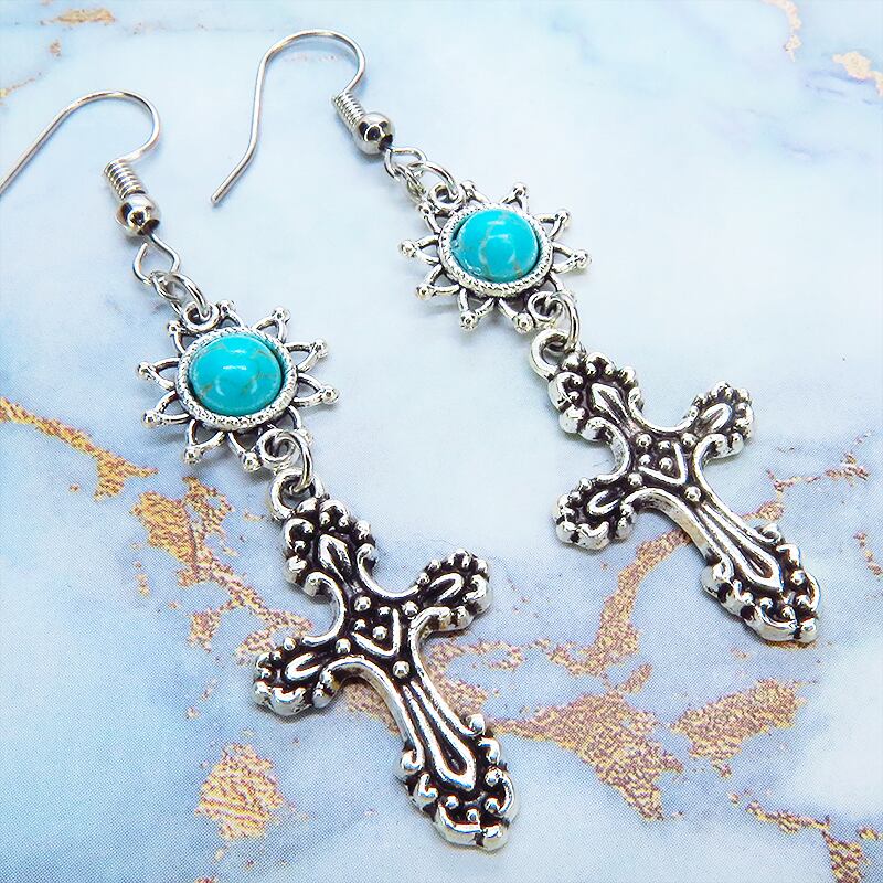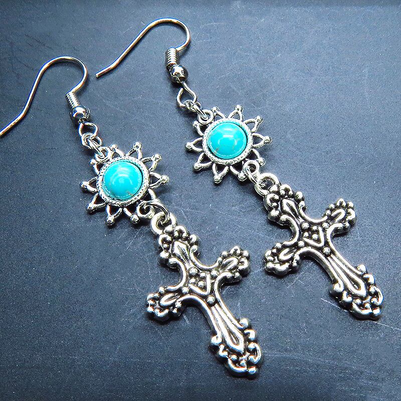 ゴシック調のロザリオとターコイズを埋め込んだひまわりモチーフが絶妙に組み合わさり、個性的でありながらも様々なスタイルに馴染むデザインです