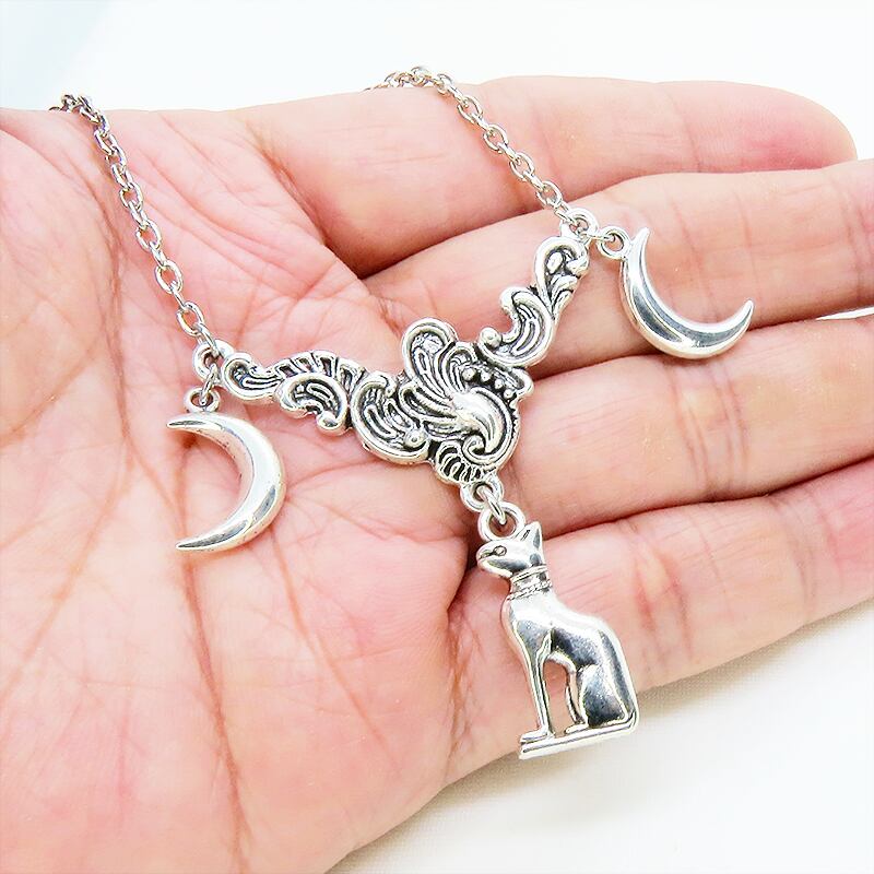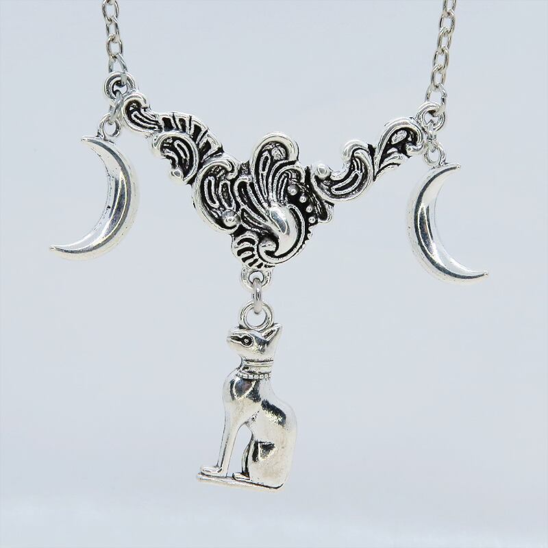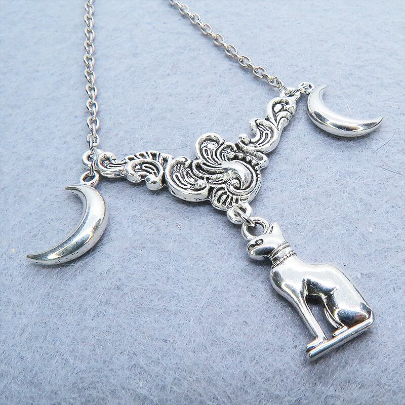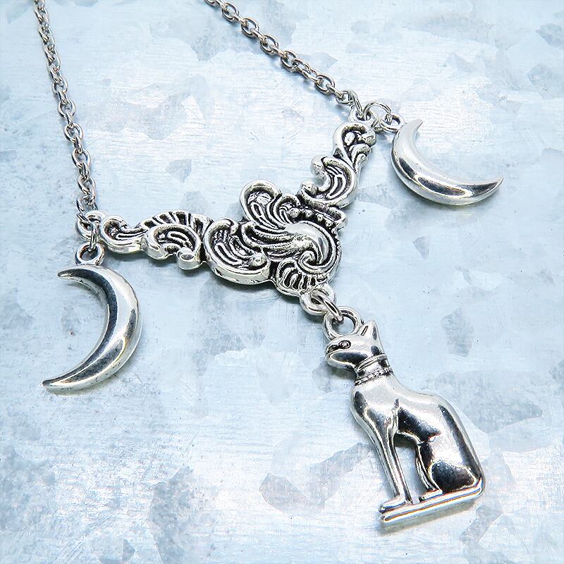 古代エジプトの猫の神様バステトをモチーフにしたチャームとその両脇に配された三日月が、異国情緒あふれる独特の世界観を表現しています