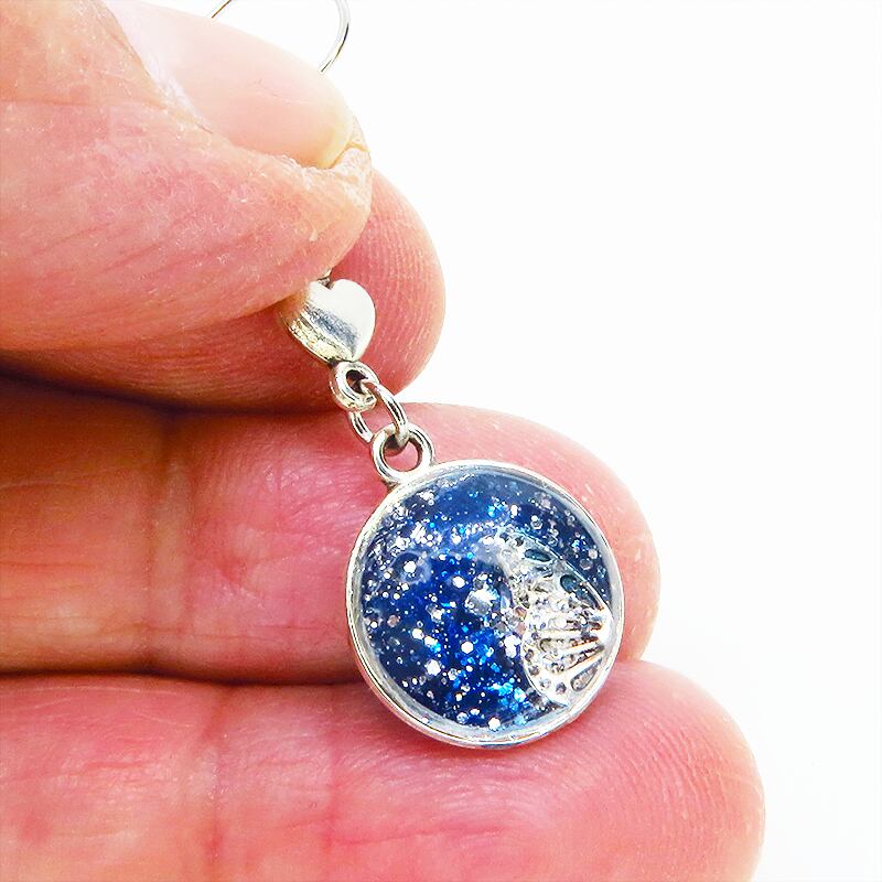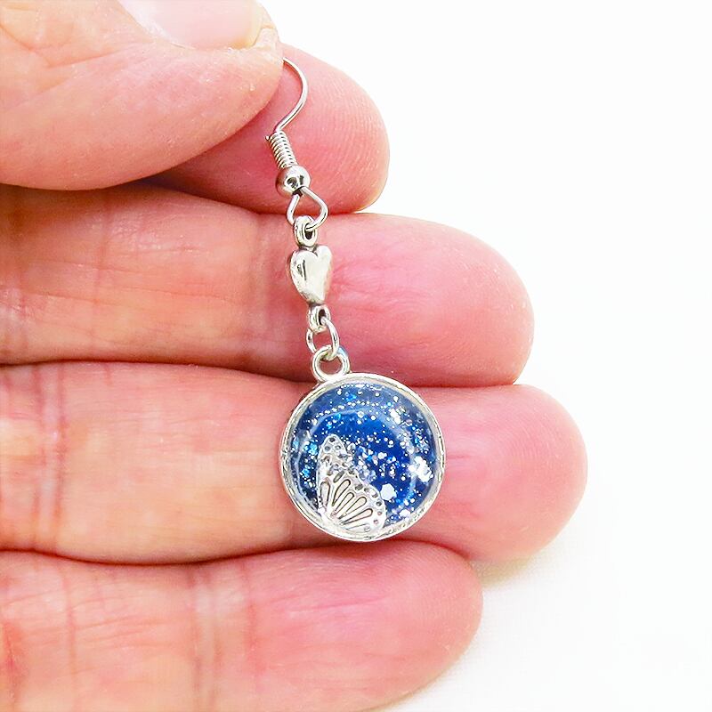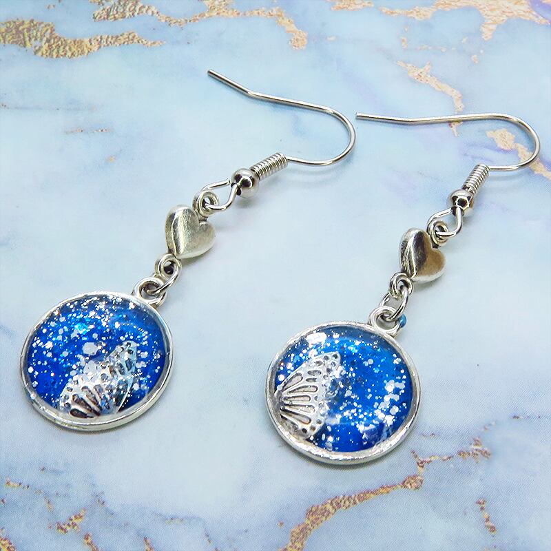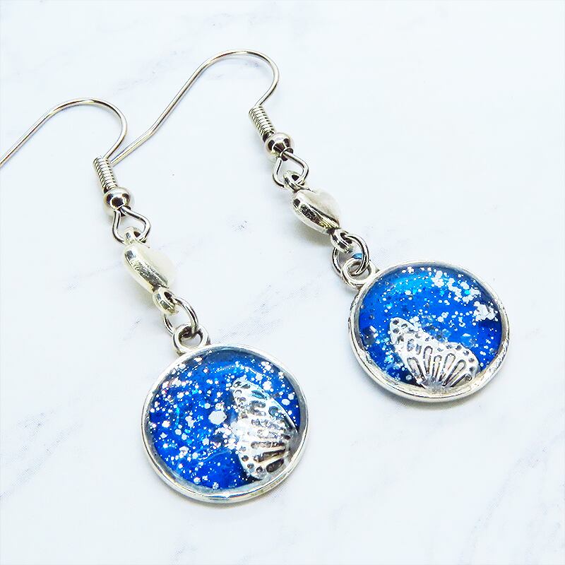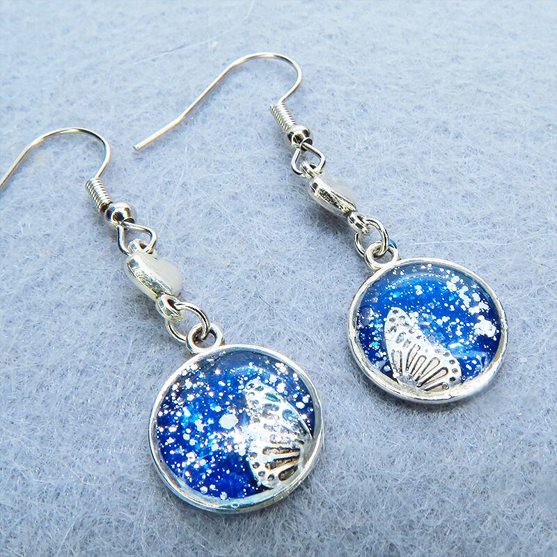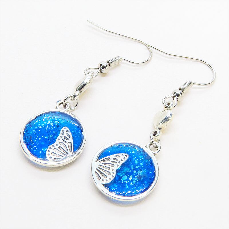 シルバーカラーの蝶の羽モチーフをマリンブルーのレジンで美しく彩色し、小さなハートモチーフを添えました