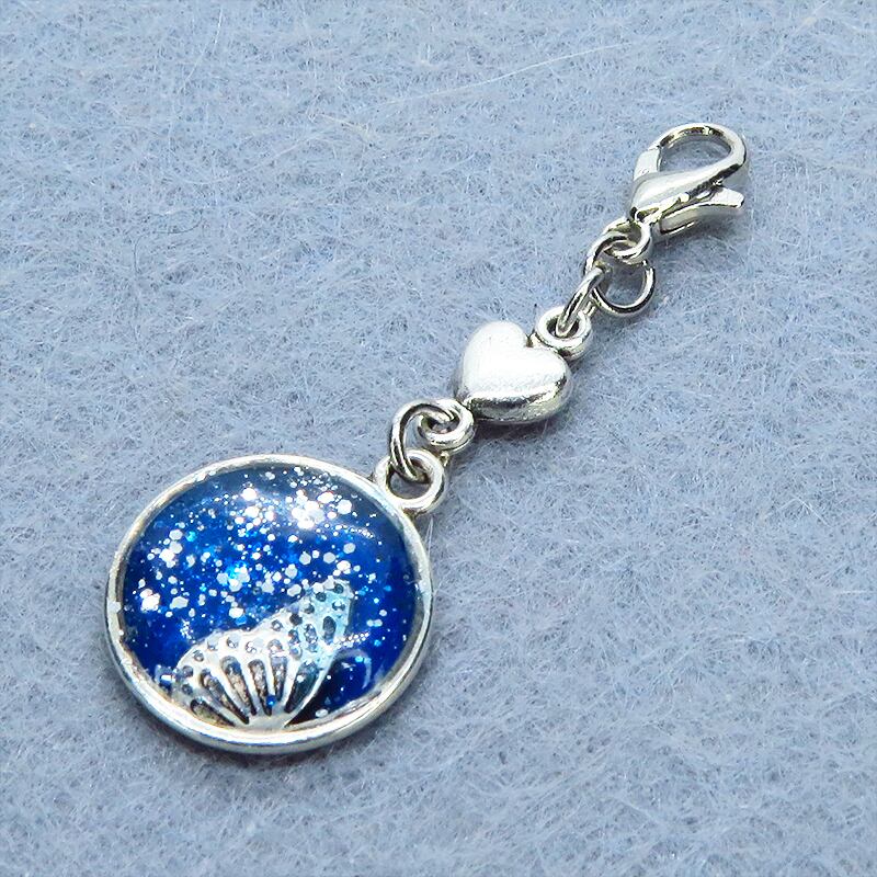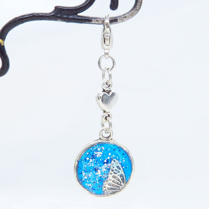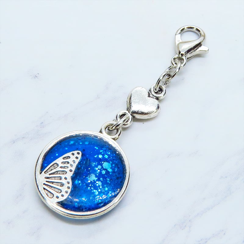 シルバーカラーの蝶の羽モチーフをマリンブルーのレジンで美しく彩色し、小さなハートモチーフを添えました