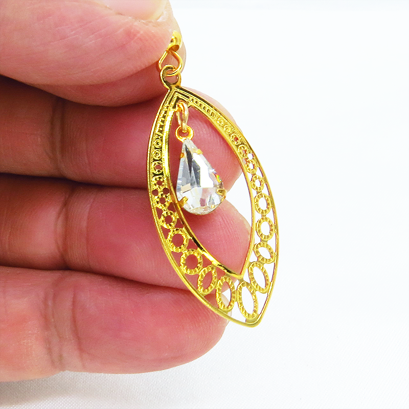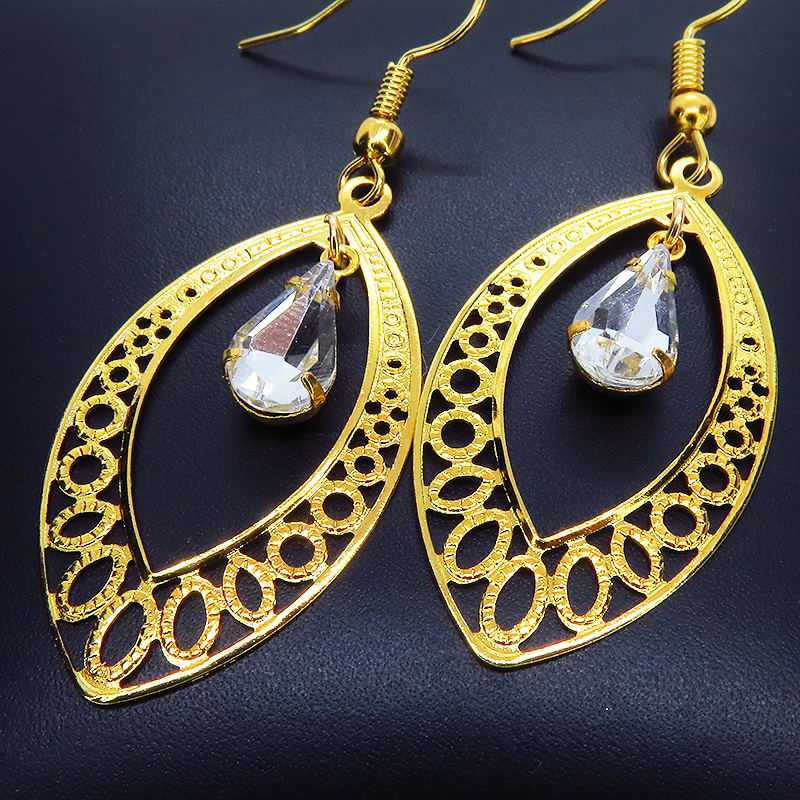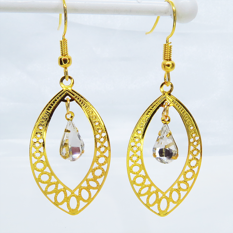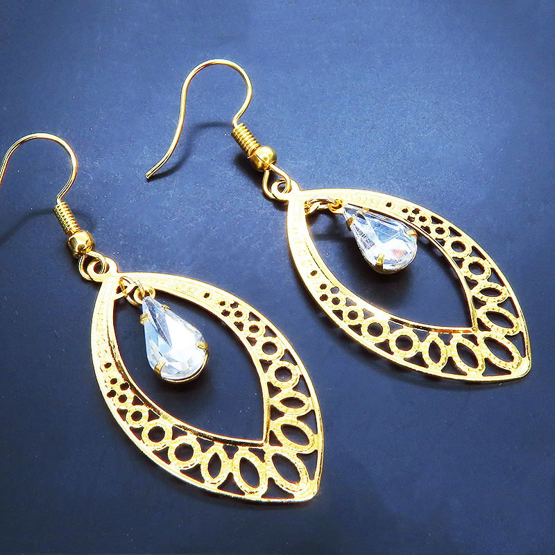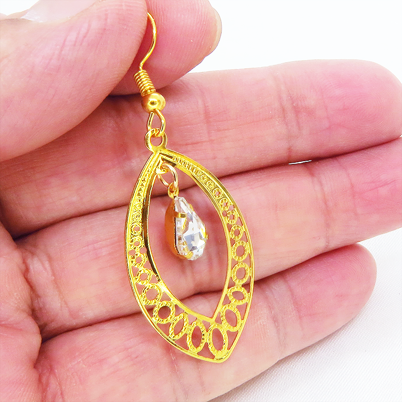 透かし模様の入ったティアドロップ型モチーフにラインストーンを吊り下げたエレガントなピアスです