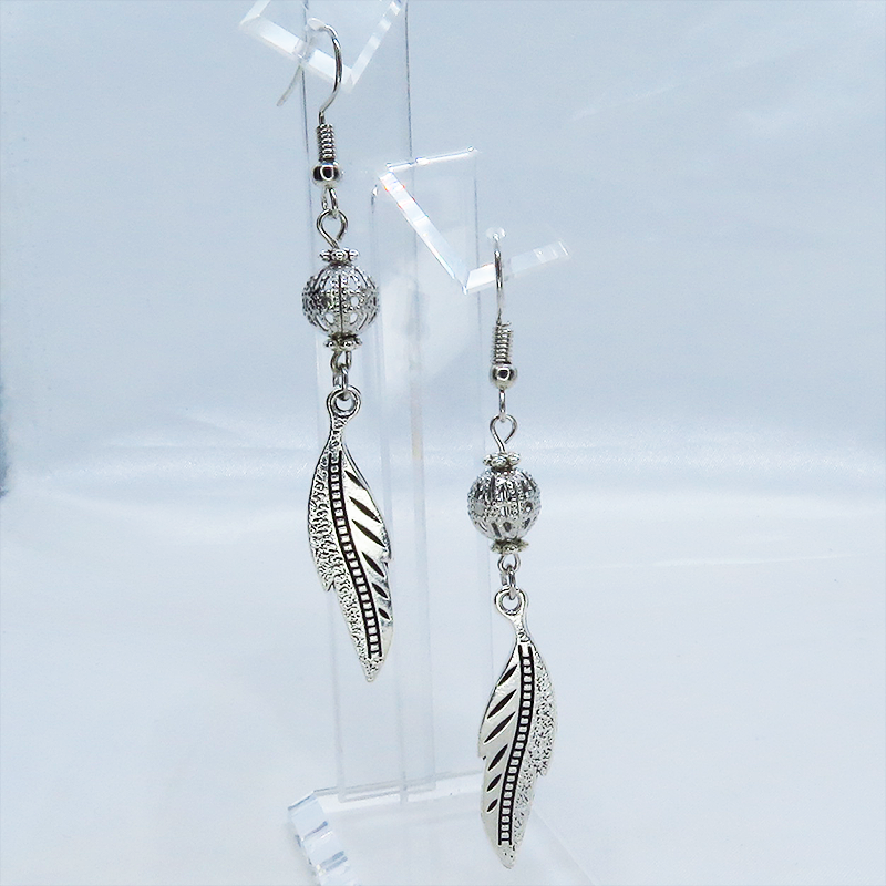 左右非対称のスマートなデザインのフェザーのモチーフとメタルビーズを組み合わせたピアスです