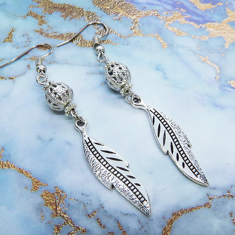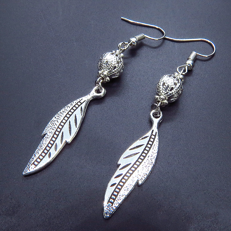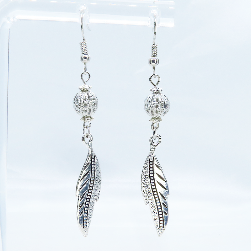 フェザーモチーフとメタルビーズが揺れるたびにキラキラと輝きます