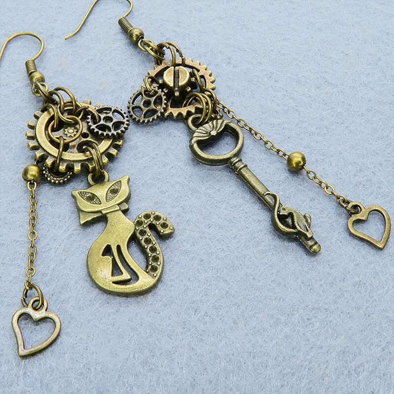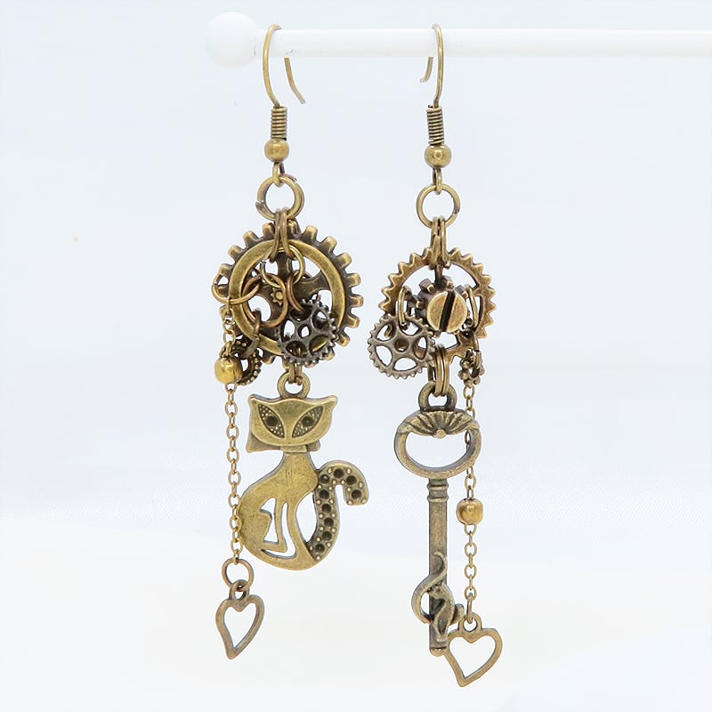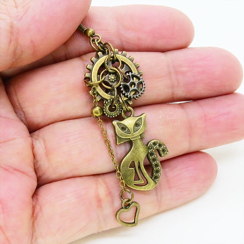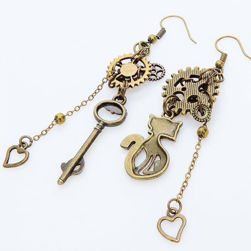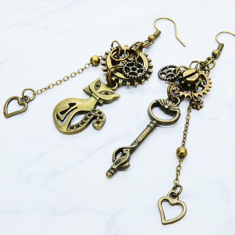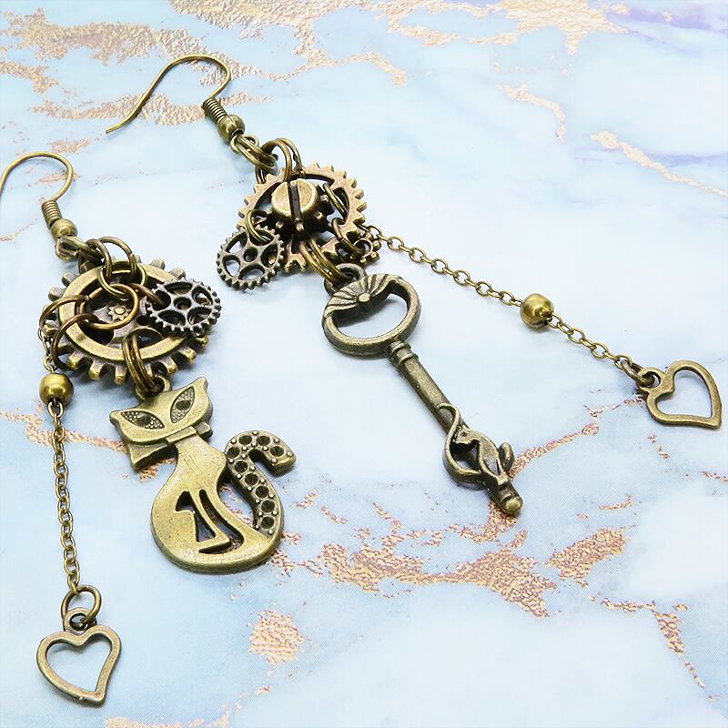 アンティークゴールドで統一された色合いの中にオリエンタルな雰囲気の猫モチーフと鍵モチーフが配され、大小異なる歯車と複雑に絡み合うチェーンがスチームパンクの世界観を演出しています