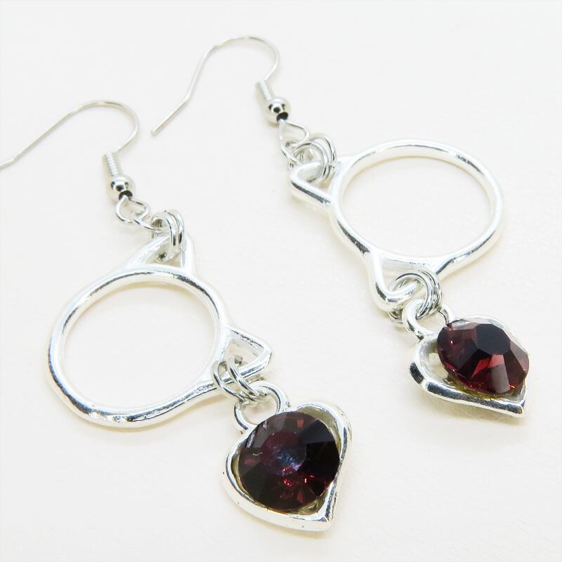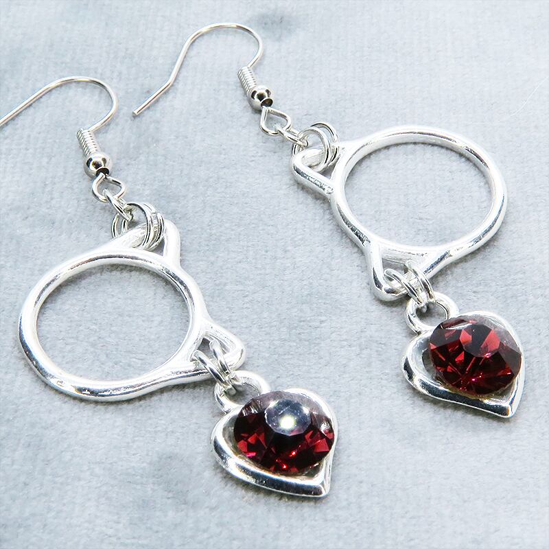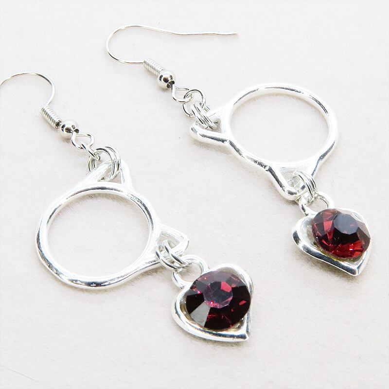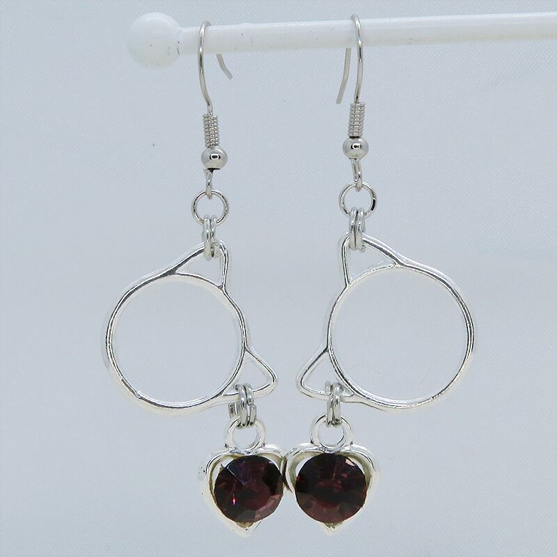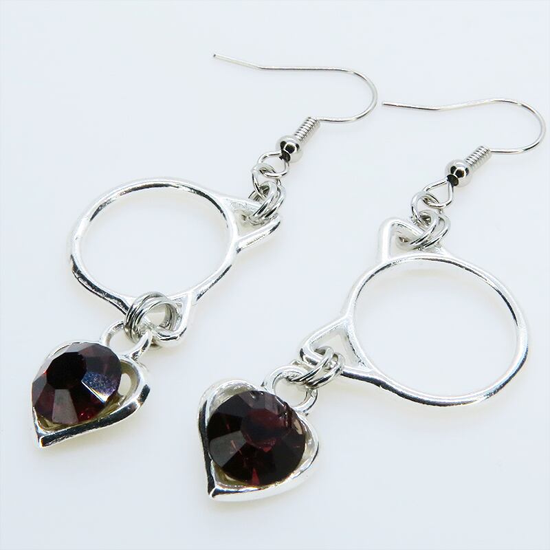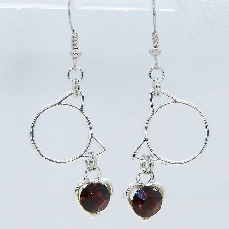 シルバーカラーの猫のフェイスフレームに、ガーネットカラーのクリスタルガラスを埋め込んだハートモチーフが揺れ、大人可愛いデザインが魅力です