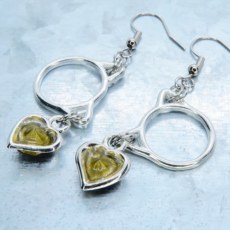 こちらのピアスの魅力は、その愛らしいモチーフと、鮮やかな輝きにあります