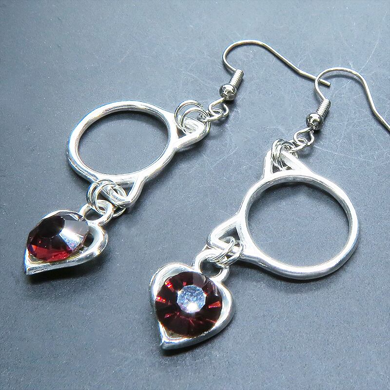 そのフレームから美しいガーネットカラーのクリスタルガラスを埋め込んだハートモチーフが吊り下げられています