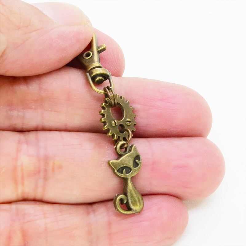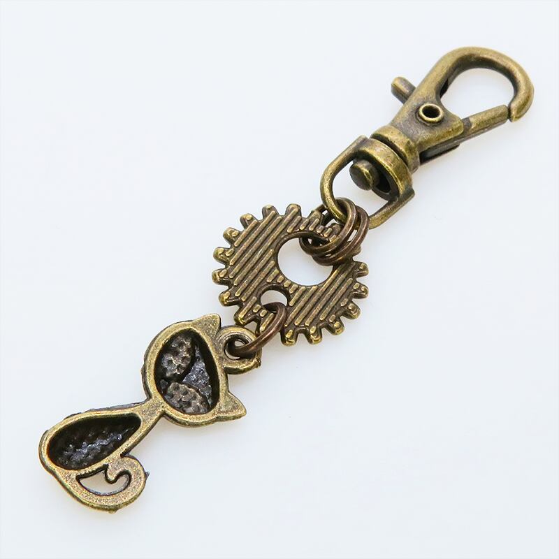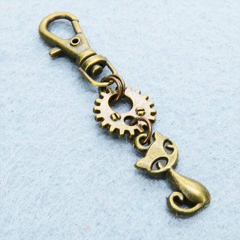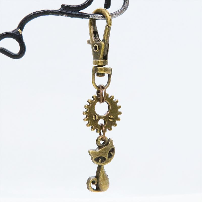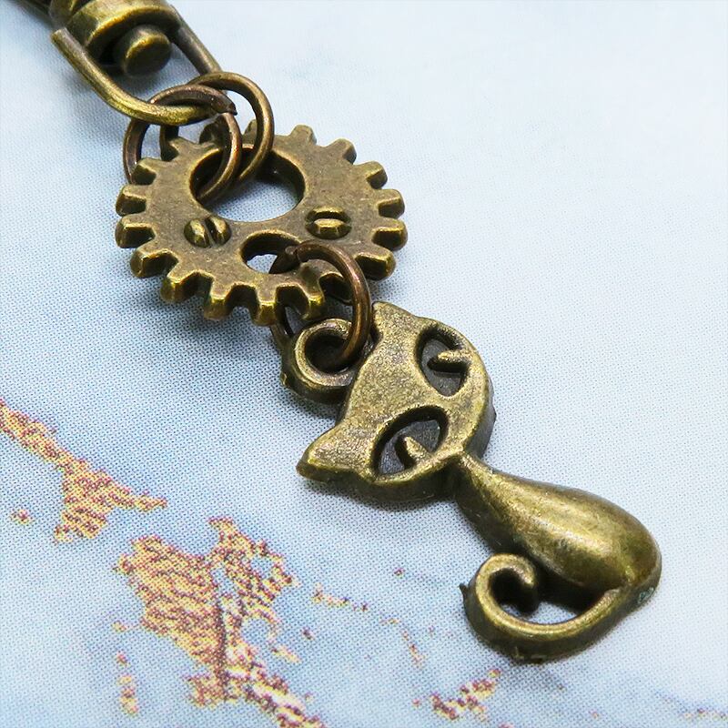 アンティークゴールドの猫と歯車が組み合わさり、どこかスチームパンクな雰囲気を漂わせます