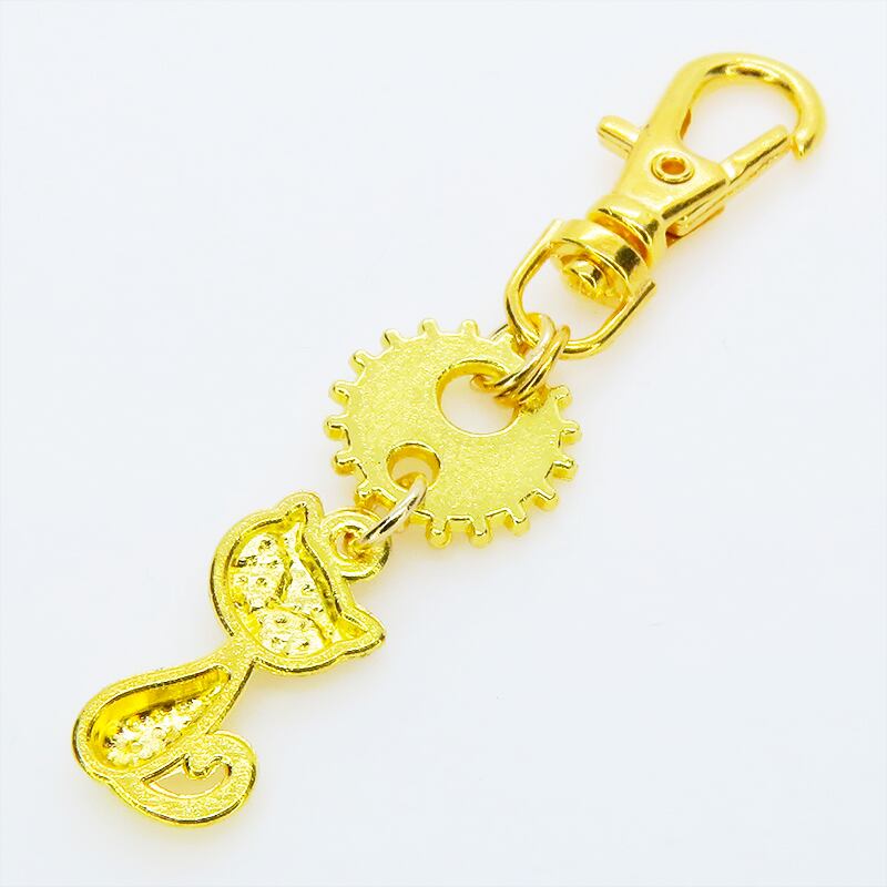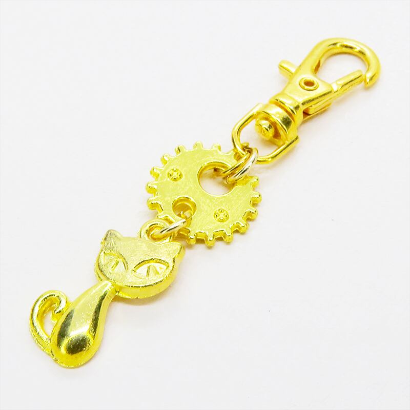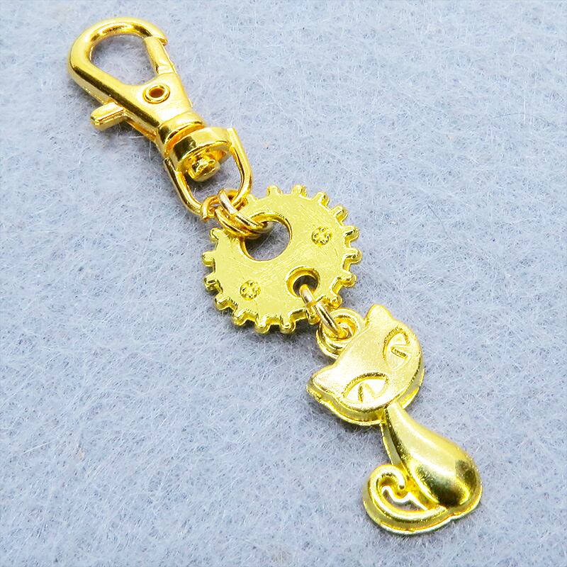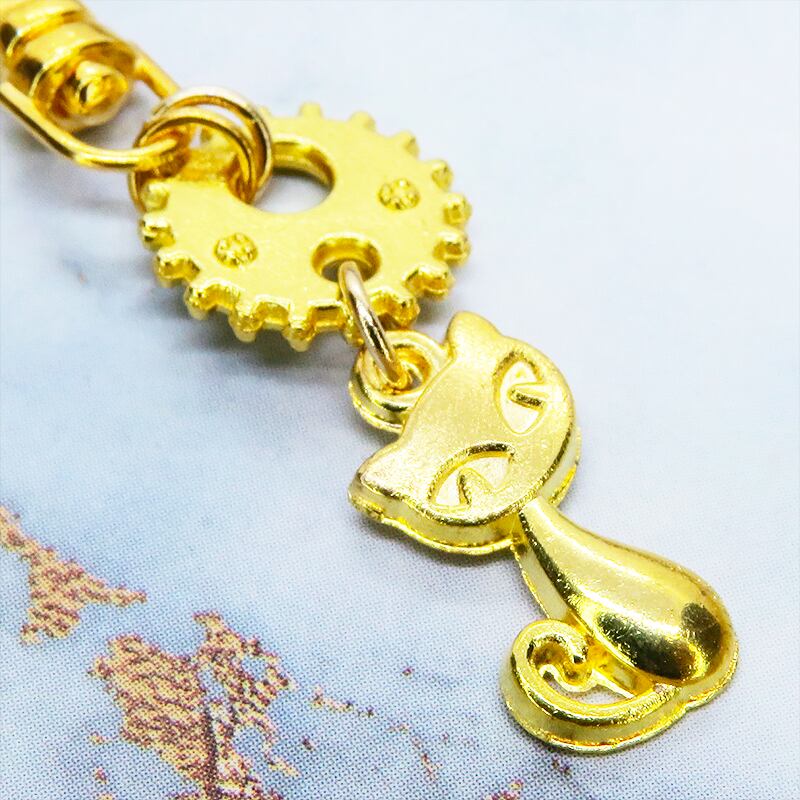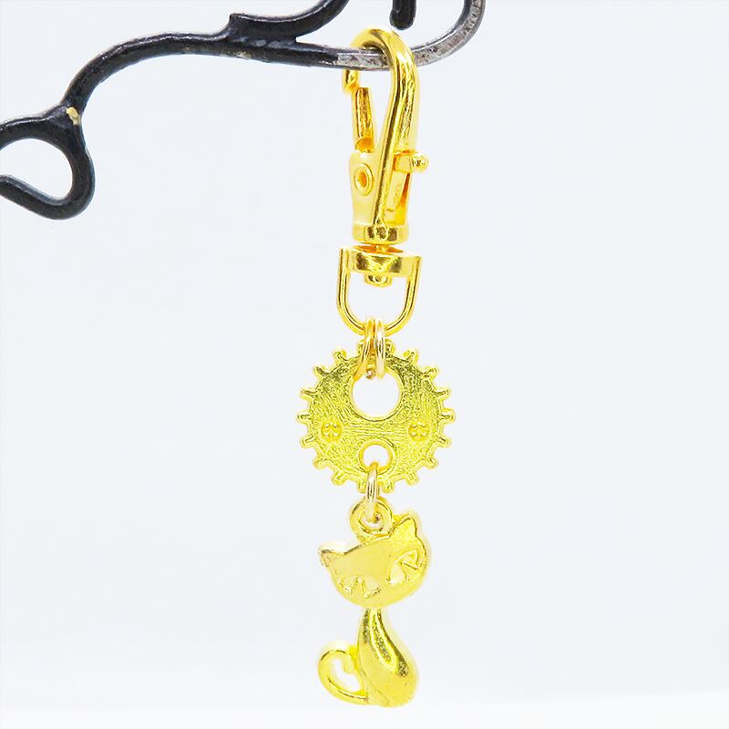 ゴールドカラーの猫と歯車が組み合わさり、どこかスチームパンクな雰囲気を漂わせます