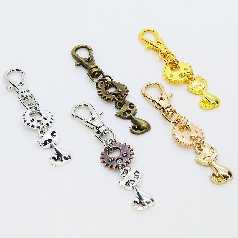 このキーホルダーの魅力は、その愛らしい猫とメカニカルな歯車の組み合わせにあります