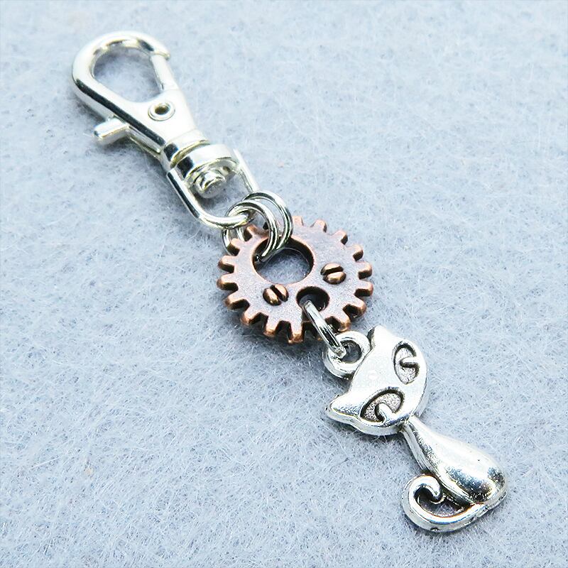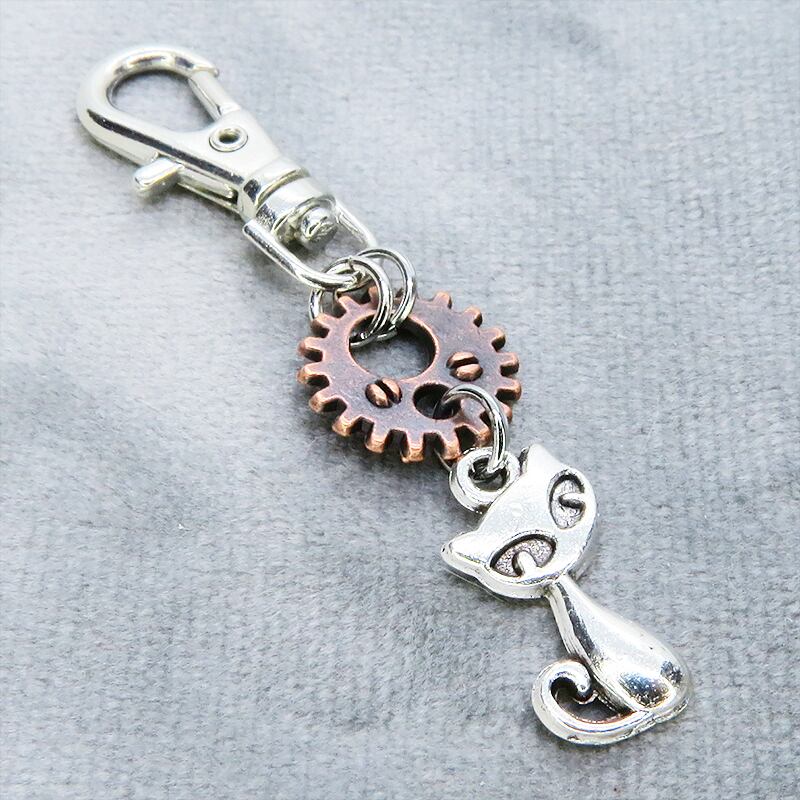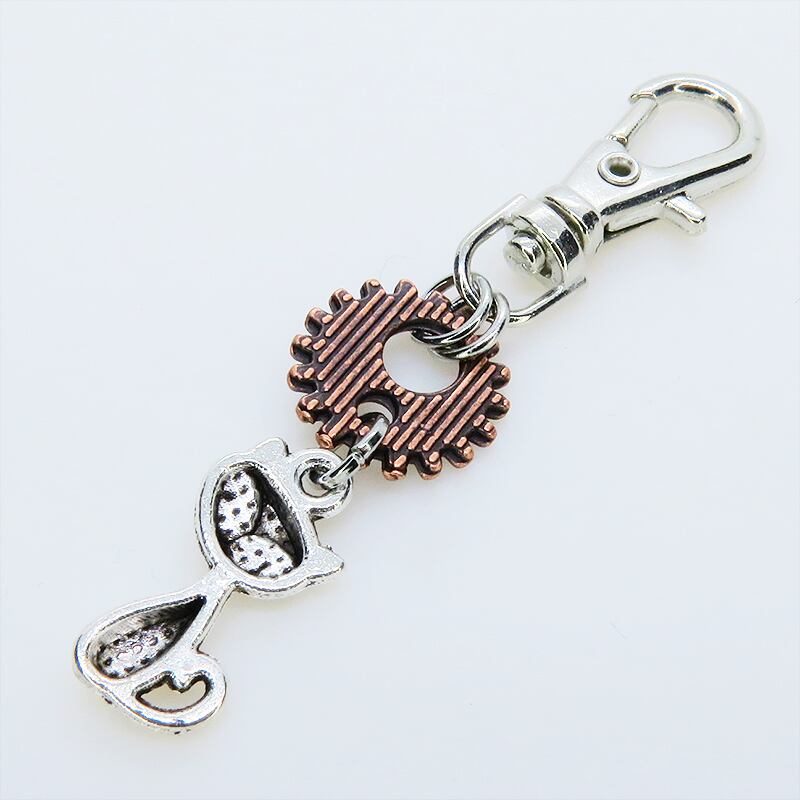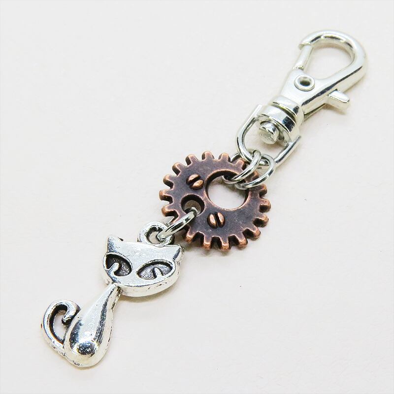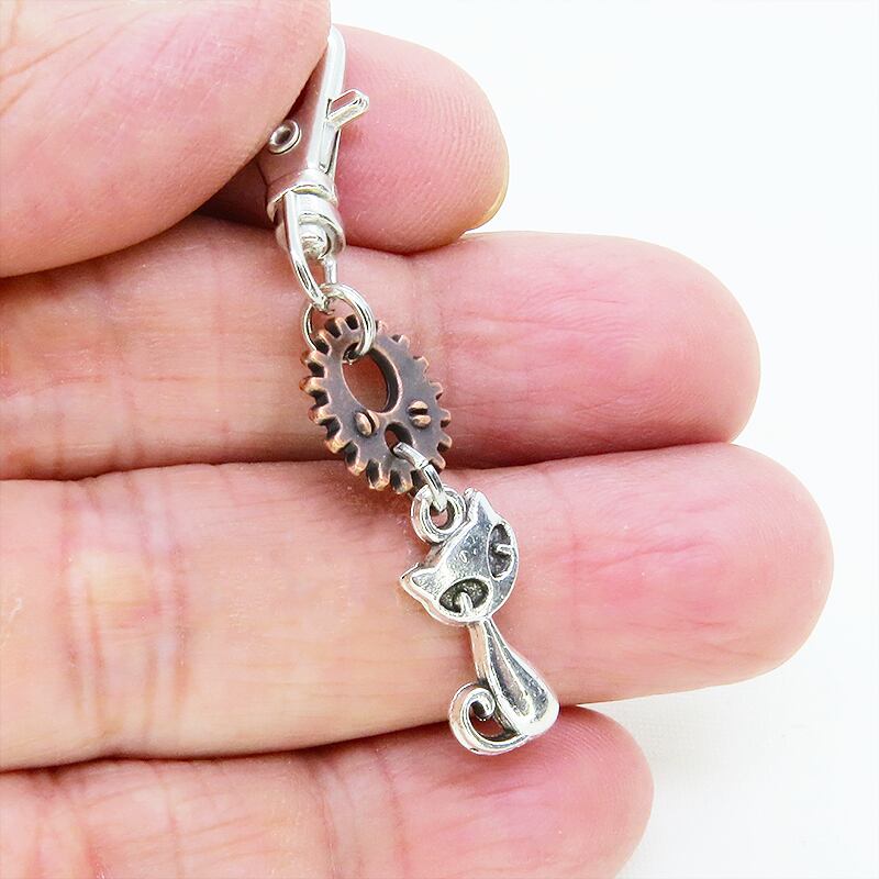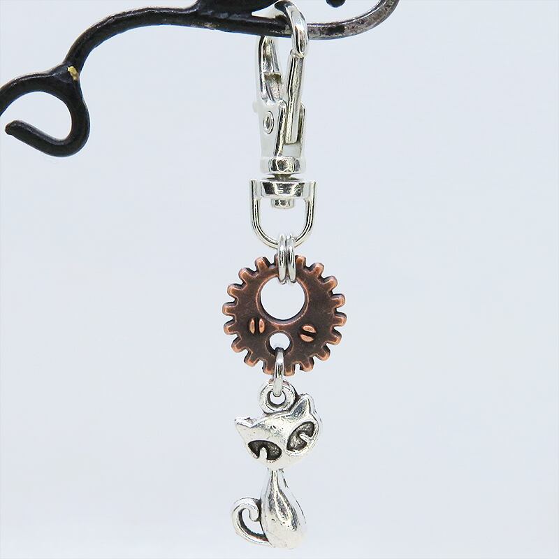 アンティークシルバーの猫とアンティークブロンズの歯車が組み合わさり、どこかスチームパンクな雰囲気を漂わせます