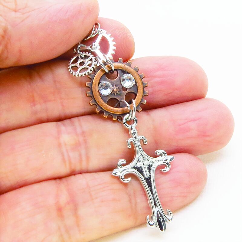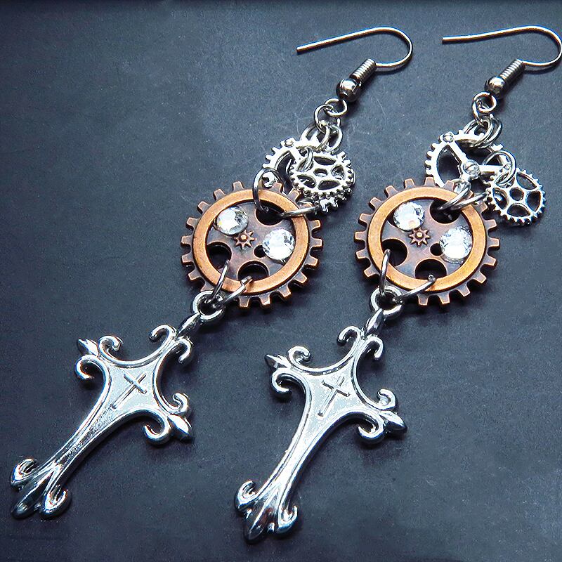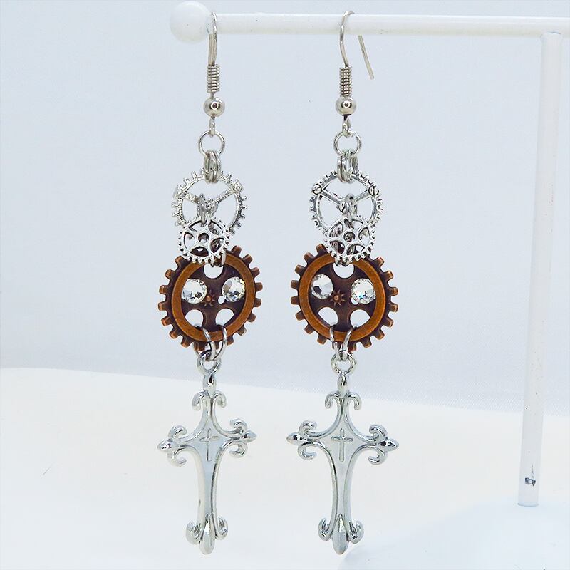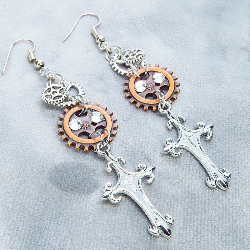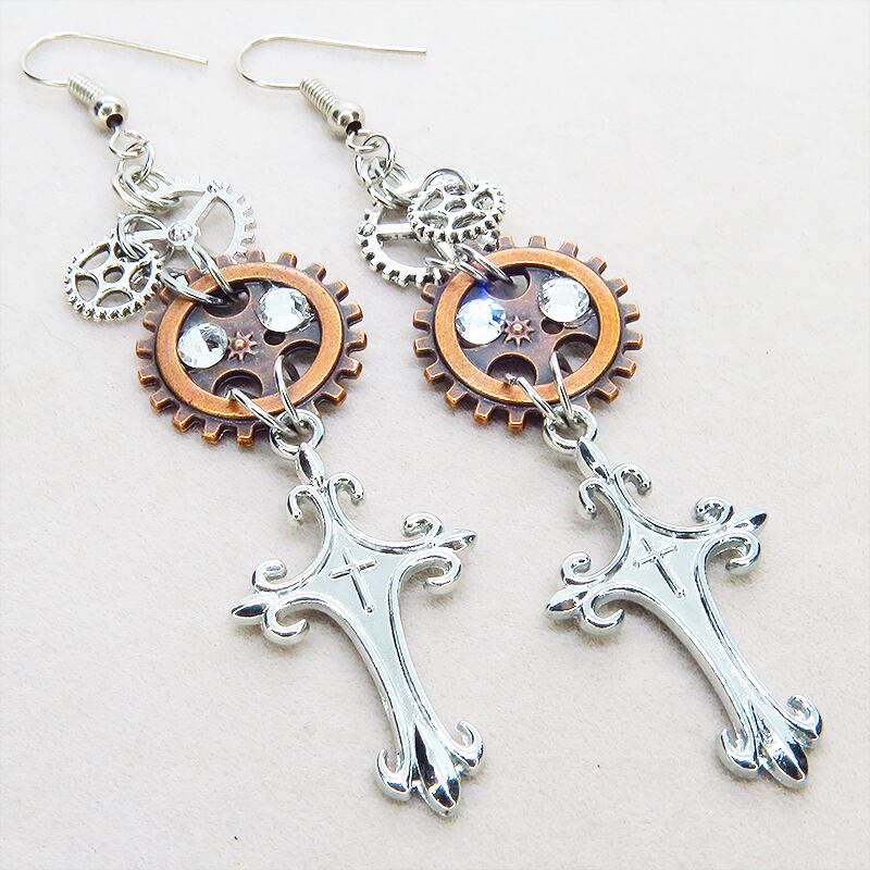 こちらのピアスの魅力は、その独創的なデザインと、細部に宿るこだわりです。メインとなるのは、繊細なロザリオモチーフ。その上部には、アンティークブロンズの大きな歯車が配されており、中心にはクリアカラーのラインストーンがはめ込まれ、さりげない輝きを放ちます。また、小さな歯車を吊り下げることで、全体のデザインに奥行きと動きを加えています。スリムなフォルムでありながらも、本格的なスチームパンクな雰囲気が漂い、耳元で確かな存在感を放ちます。アンティークシルバーとアンティークブロンズのバイカラーが、どんなファッションにも合わせやすく、個性を上品に演出します。
