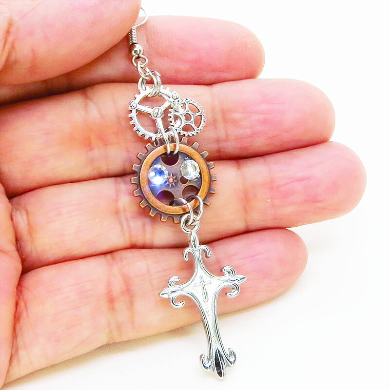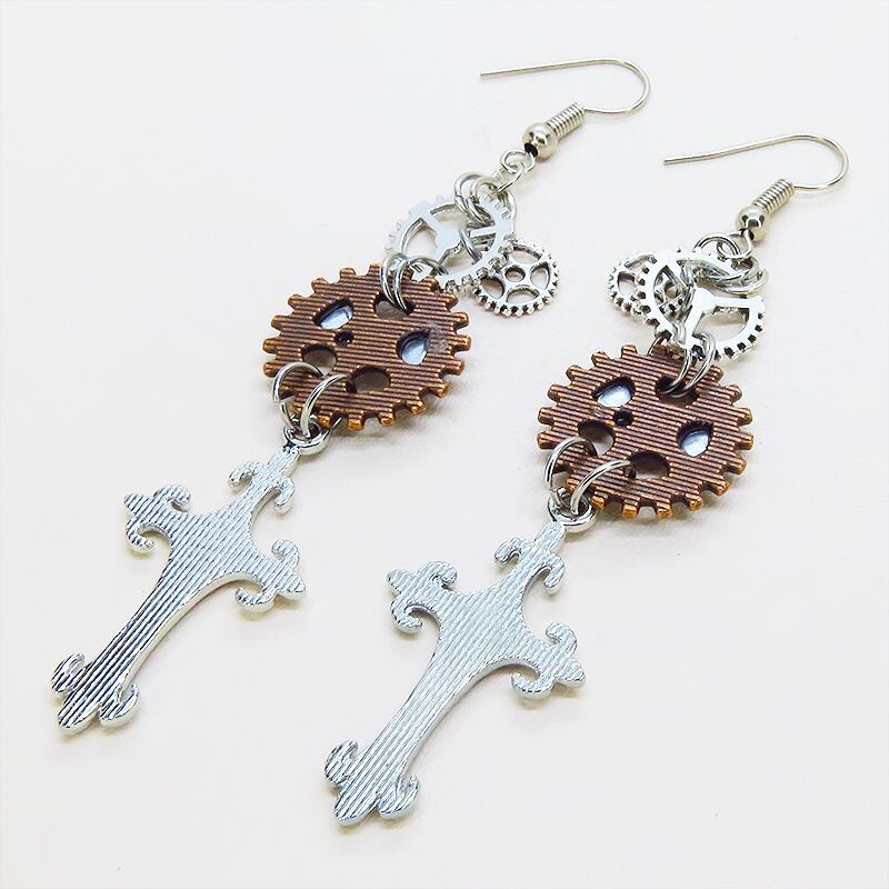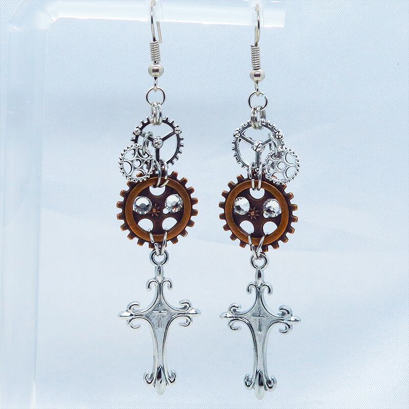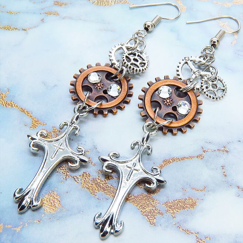 あなたの耳元に、個性が光るピアスです。アンティークシルバーのロザリオモチーフと、アンティークブロンズの歯車が組み合わさり、スチームパンクの世界観を表現しています。異なるカラーとモチーフが織りなすユニークなデザインが、あなたのスタイルをより魅力的に彩ります。