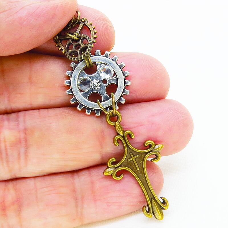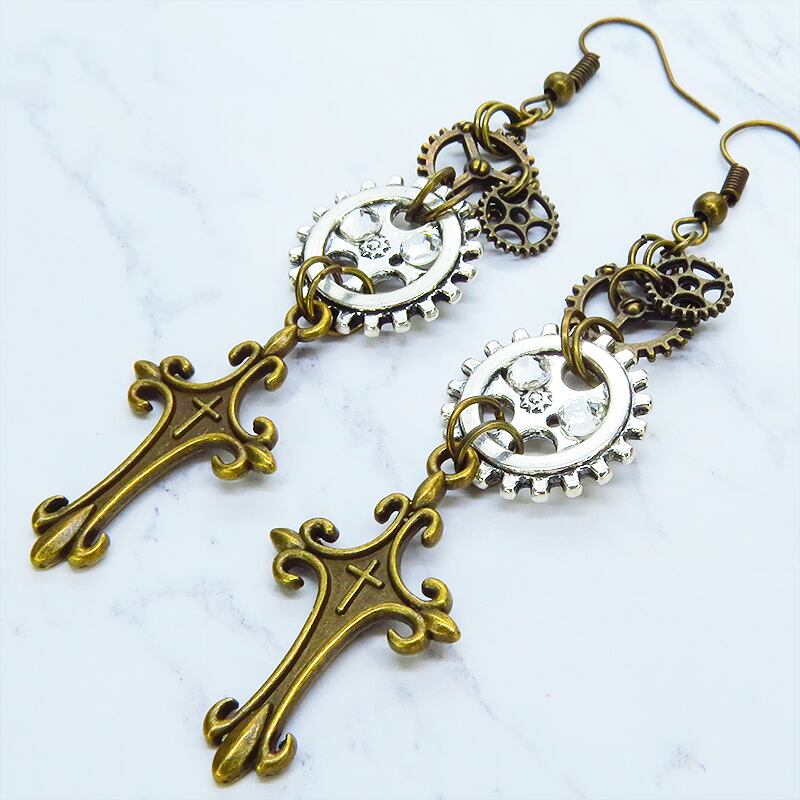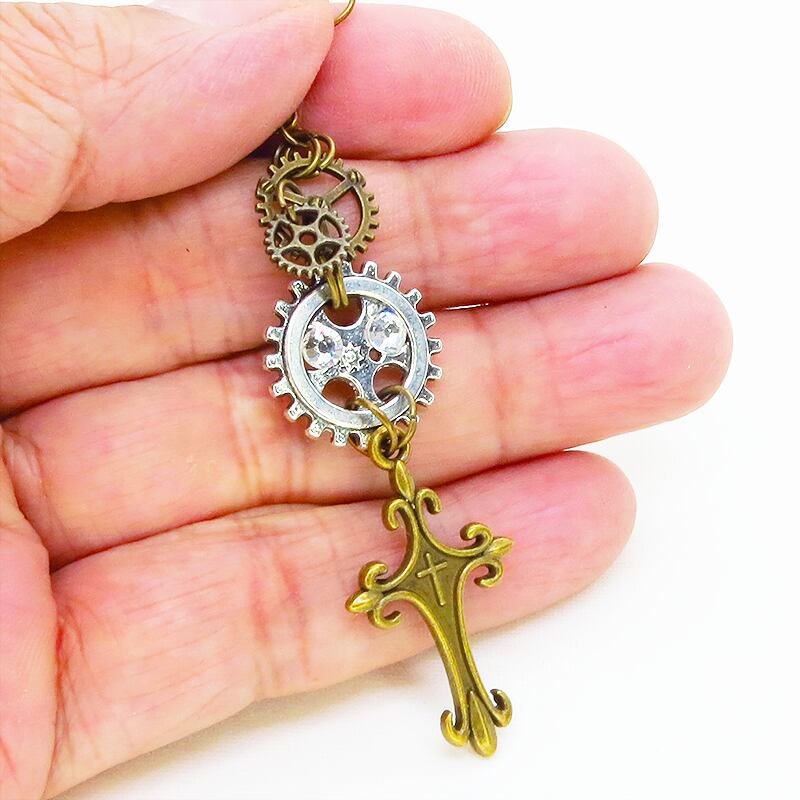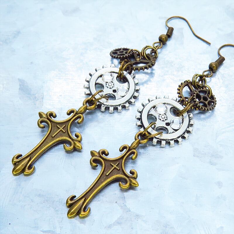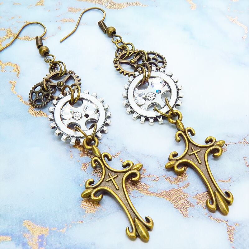 アンティークゴールドのロザリオモチーフとアンティークシルバーの歯車が組み合わさり、スチームパンクの世界観を表現しています