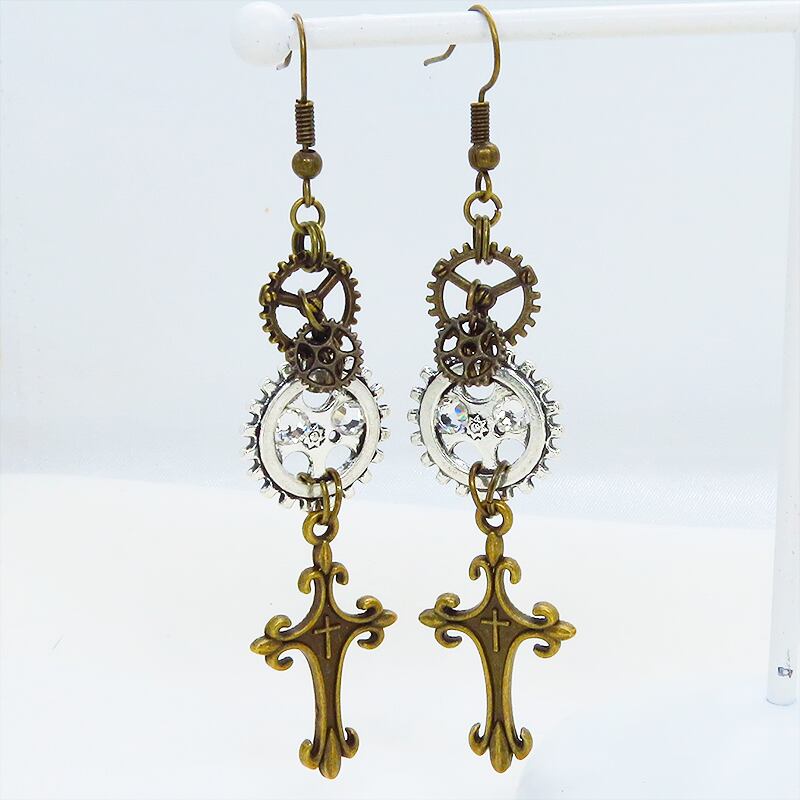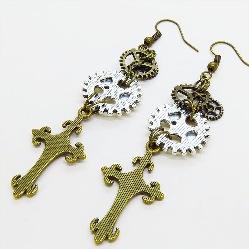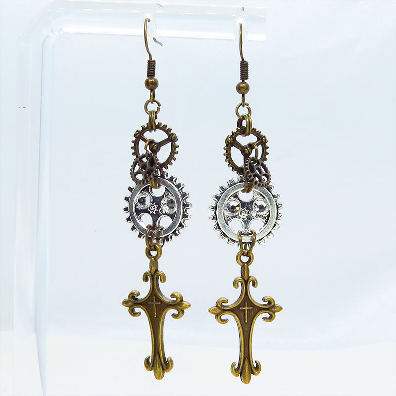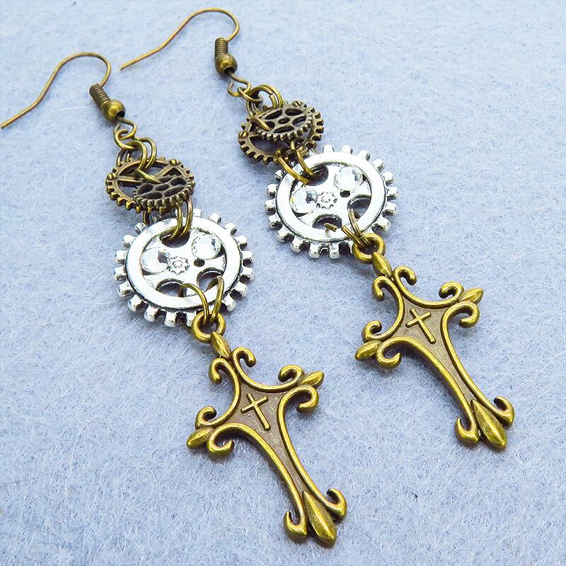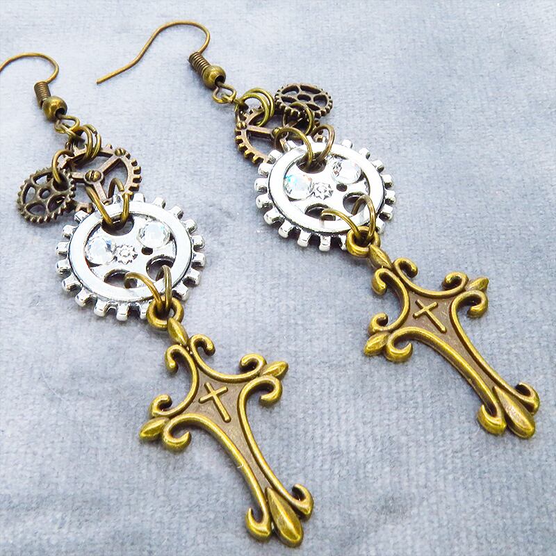 アンティークゴールドのロザリオモチーフとアンティークシルバーの歯車が組み合わさり、スチームパンクの世界観を表現しています