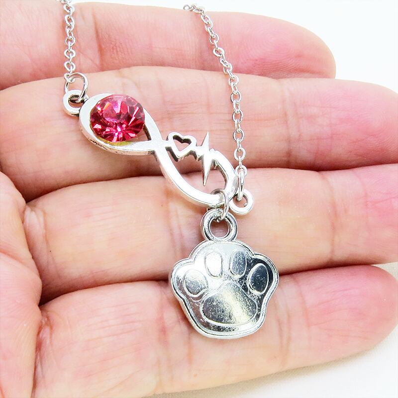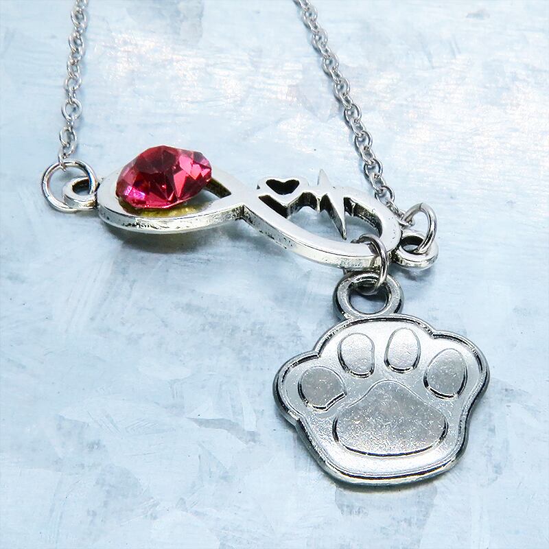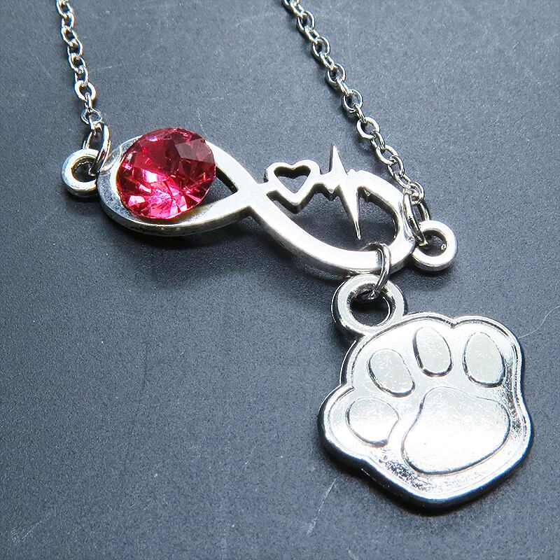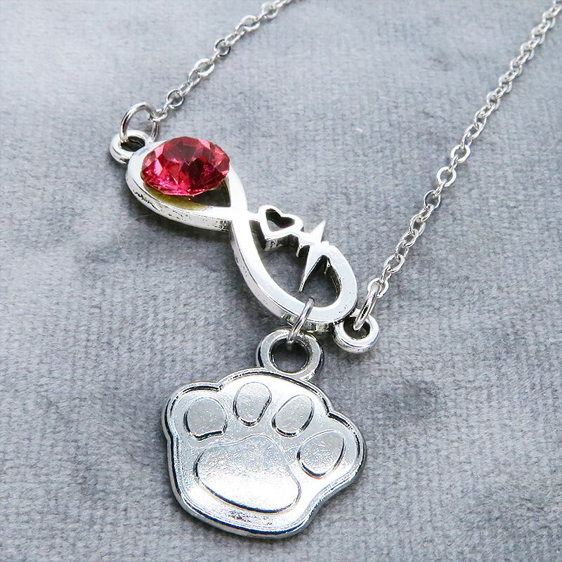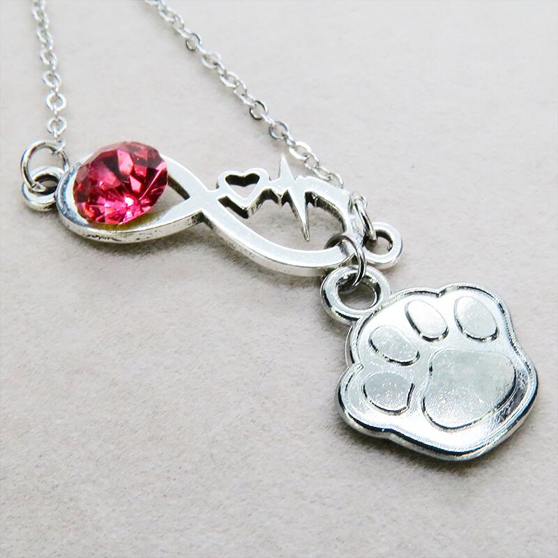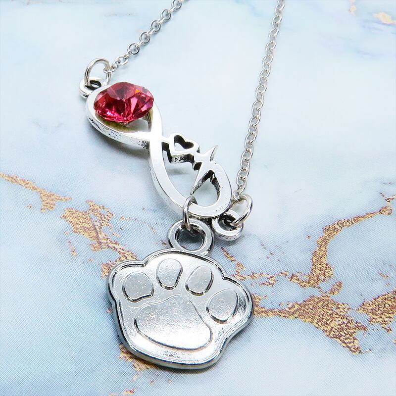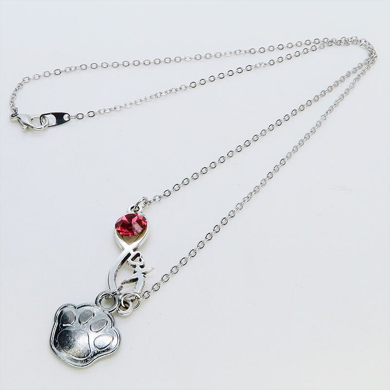 シルバーカラーの肉球モチーフとマゼンタカラーの赤いクリスタルをはめ込んだエターニティーモチーフが組み合わさり、大人可愛いデザインが魅力です
