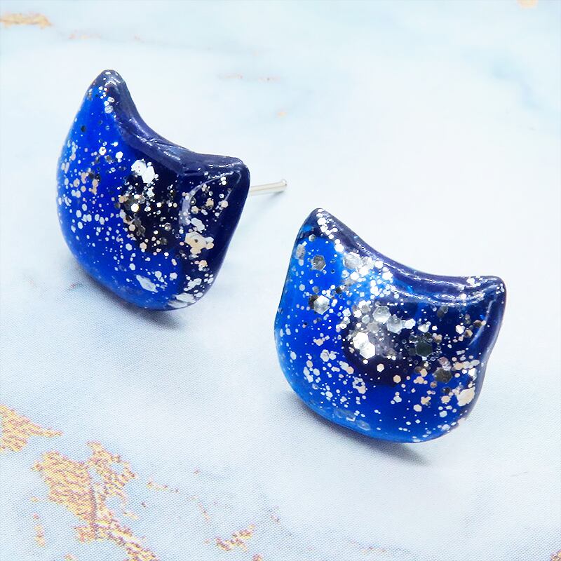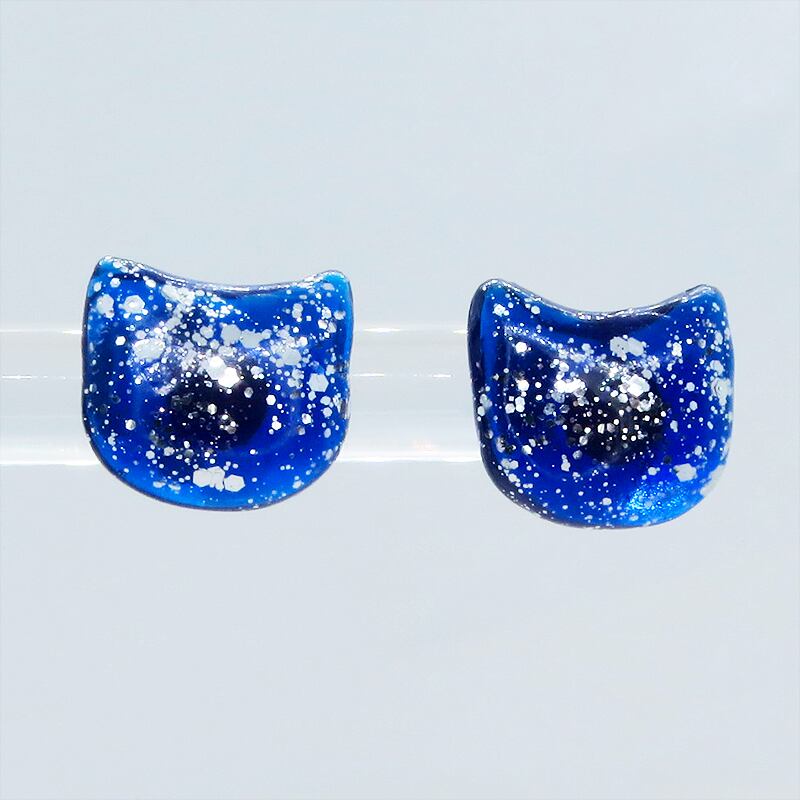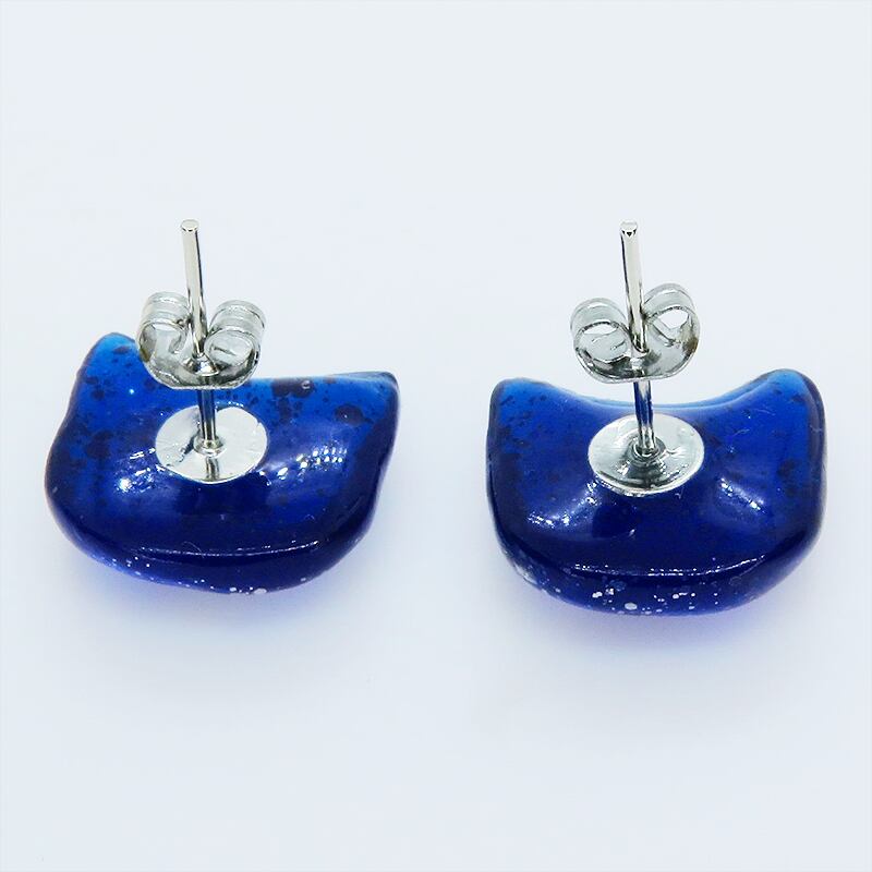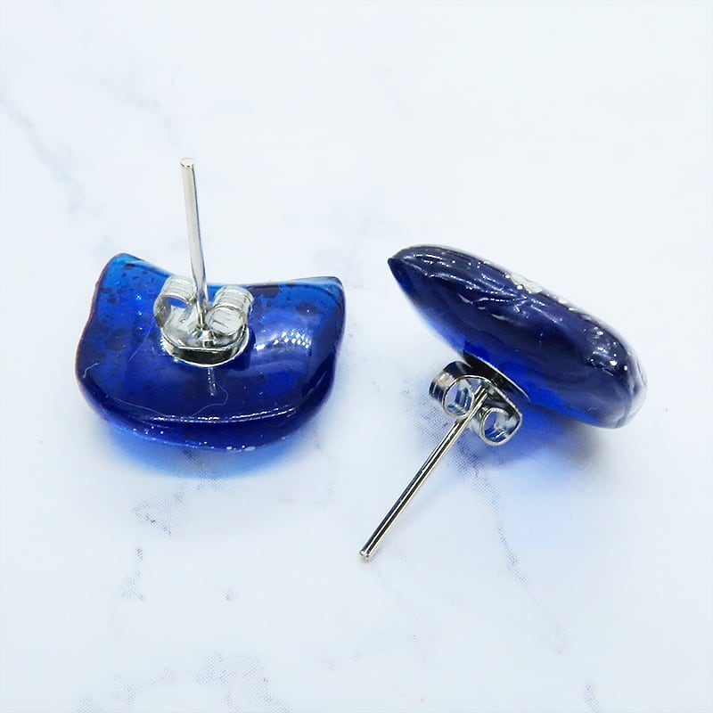 マリンブルーカラーのレジンで象った猫のフェイスモチーフが耳元で上品に輝きます