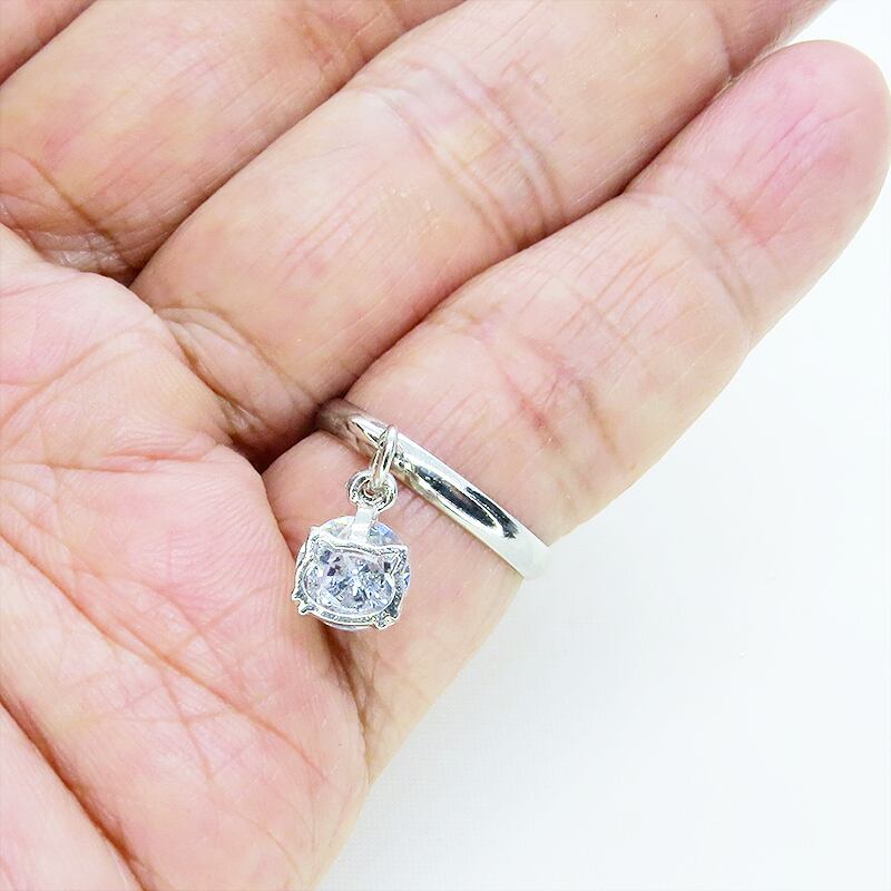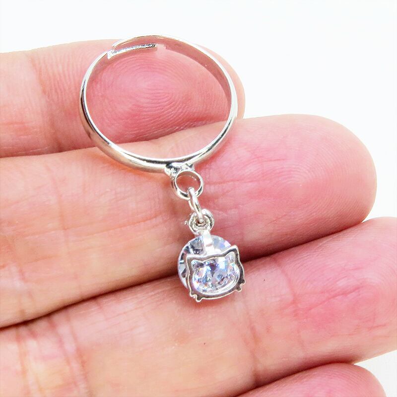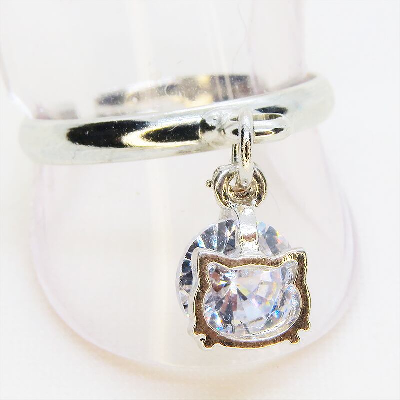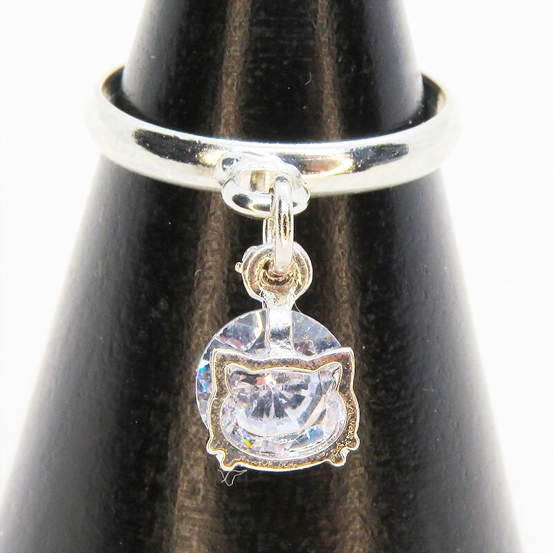シルバーカラーのリングに、猫のフレームで縁取られたキュービックジルコニアのチャームを吊るしました