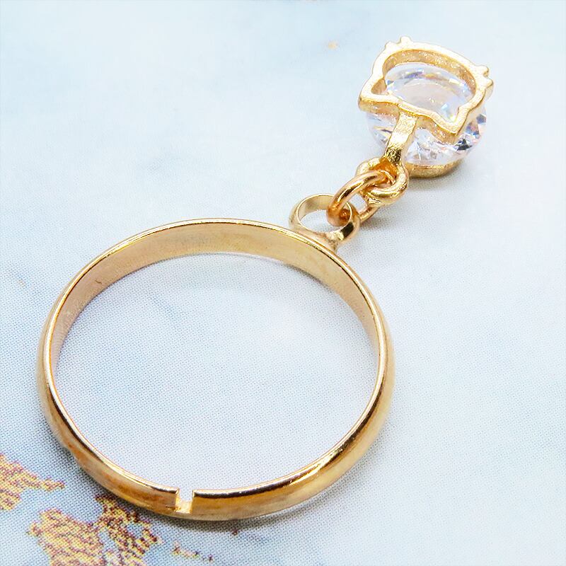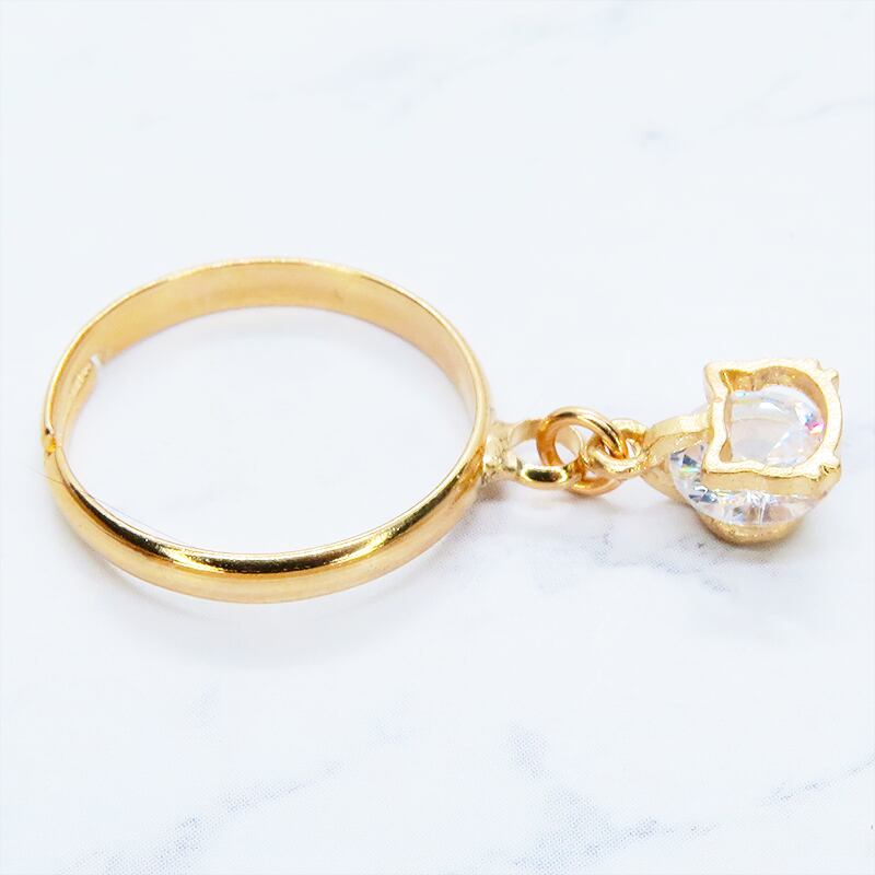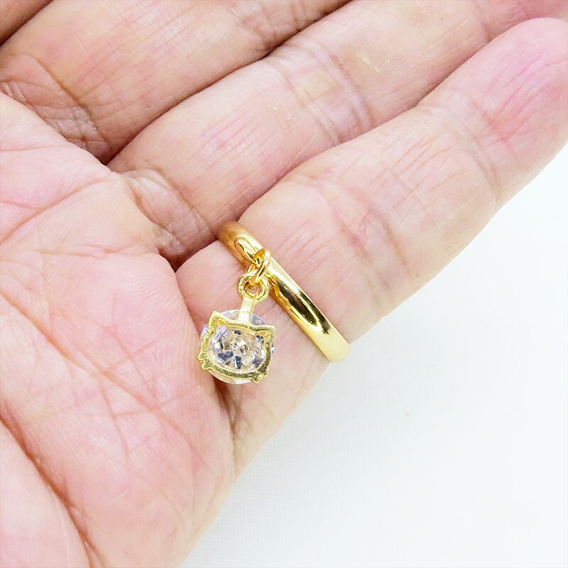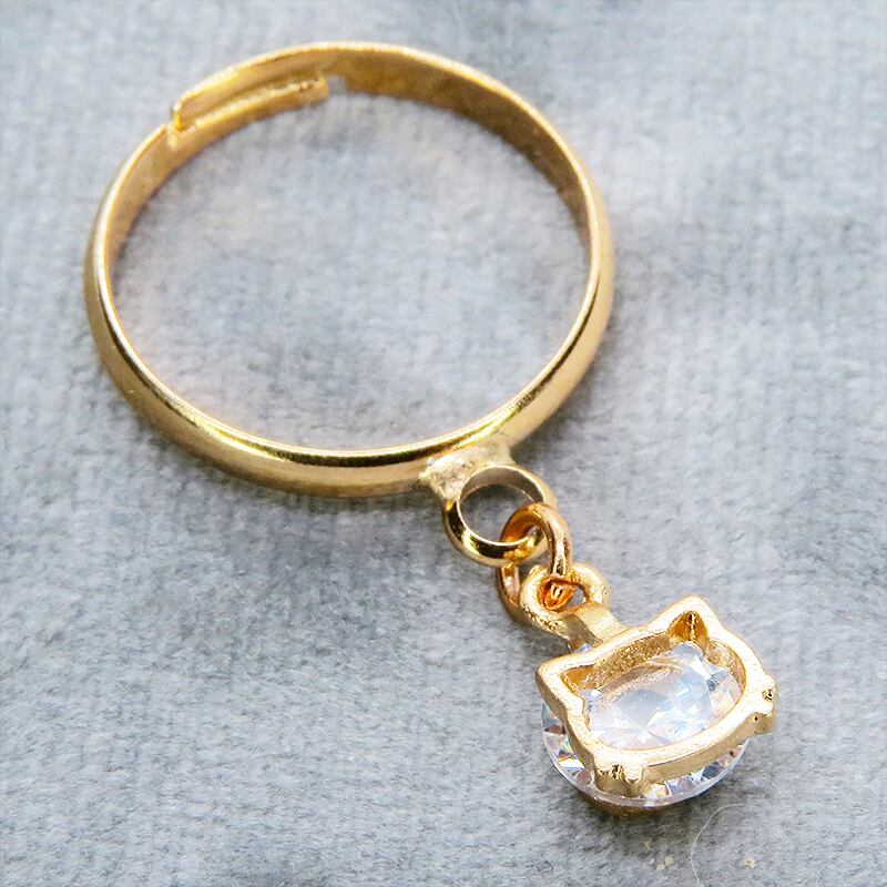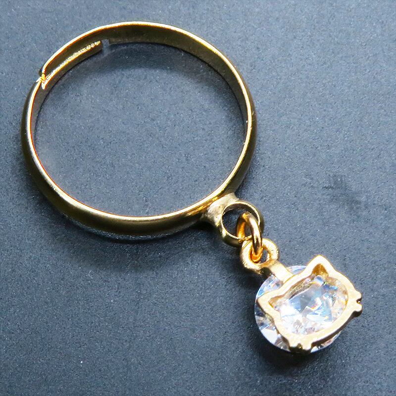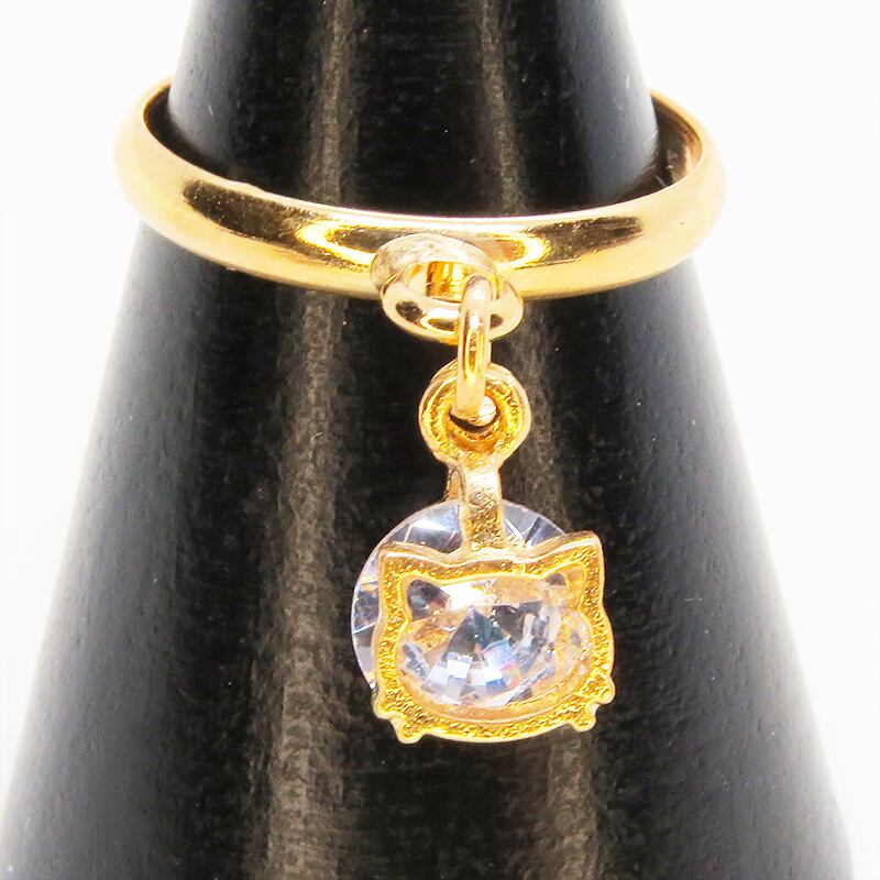 マットゴールドのリングに、猫のフレームで縁取られたキュービックジルコニアのチャームを吊るしました