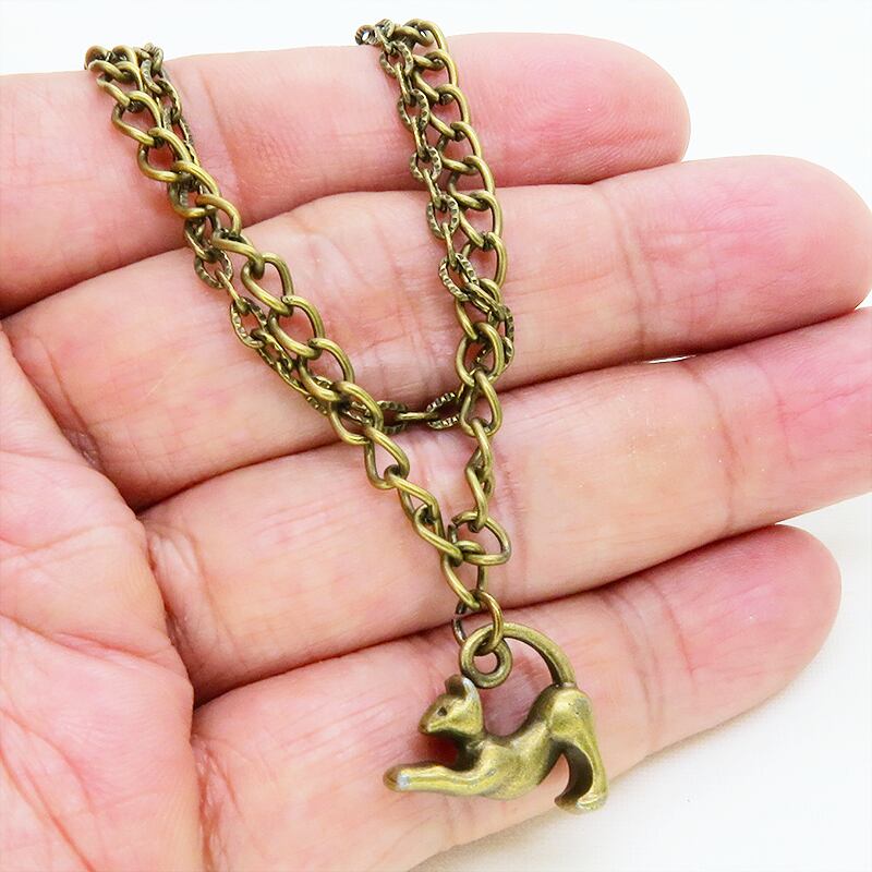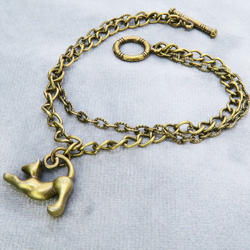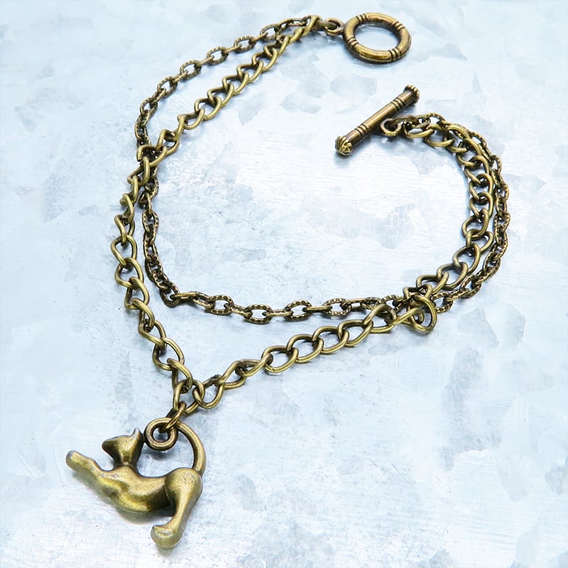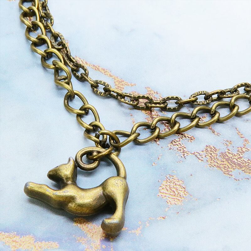 太さの異なるアンティークゴールドのチェーンを重ねたダブルチェーンのデザインに、伸び猫のシルエットモチーフをチャームとしてあしらいました