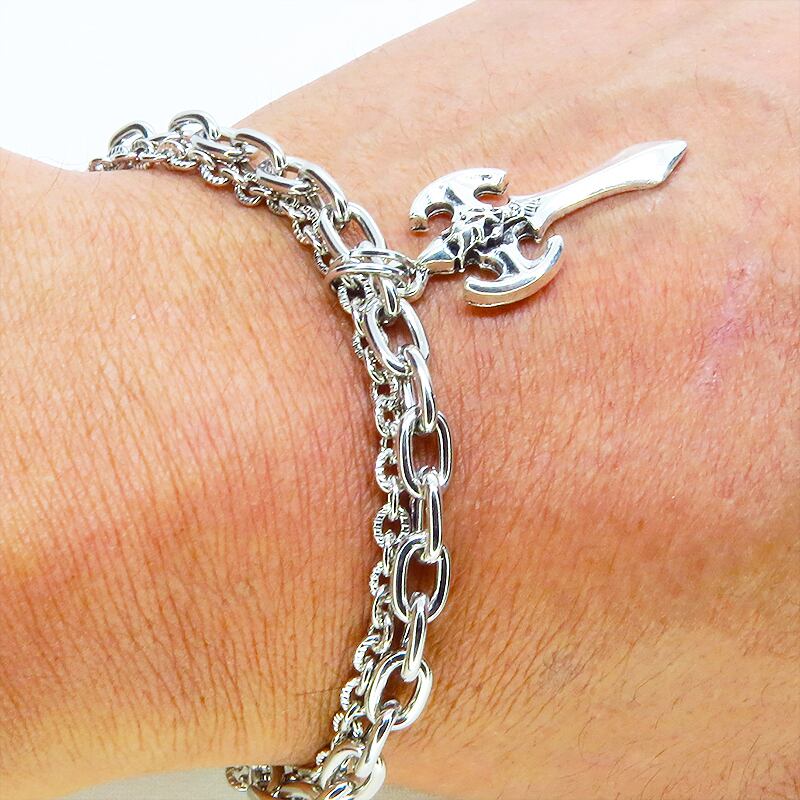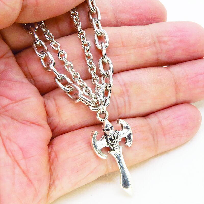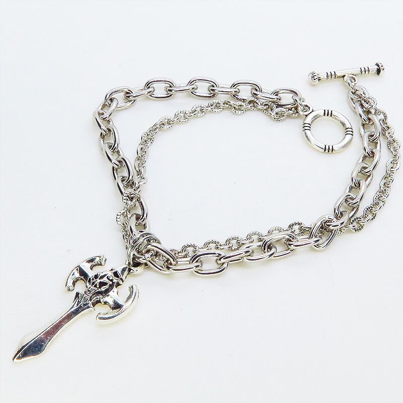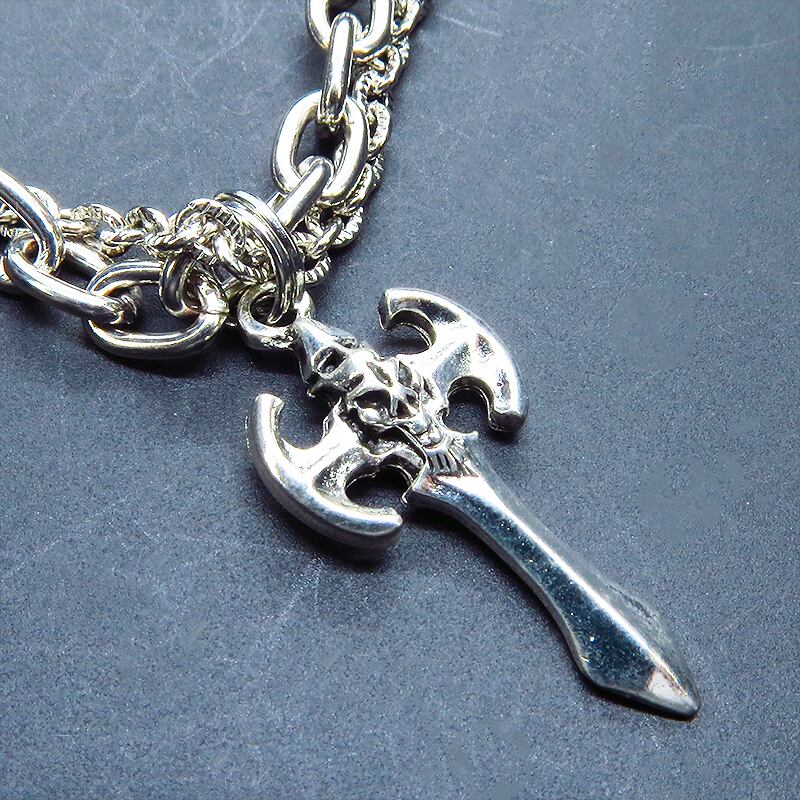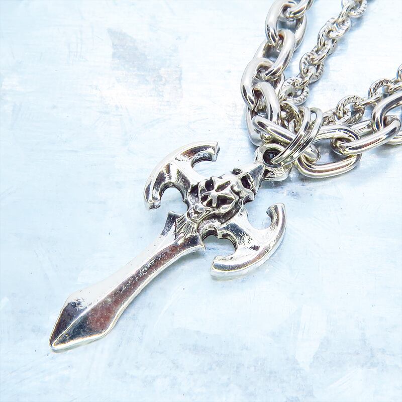 太さの異なるシルバーカラーのチェーンを重ねたダブルチェーンのデザインに、ゴシック調のソードモチーフをチャームとしてあしらいました