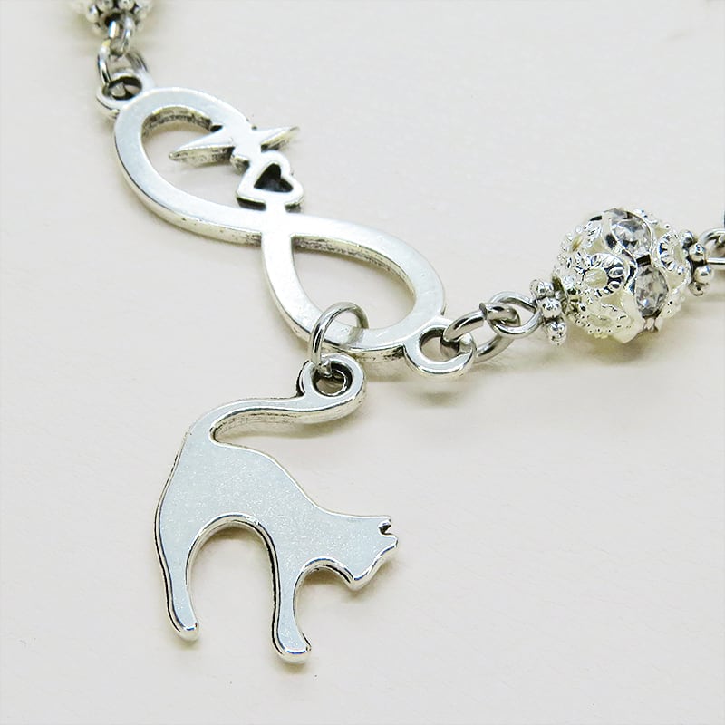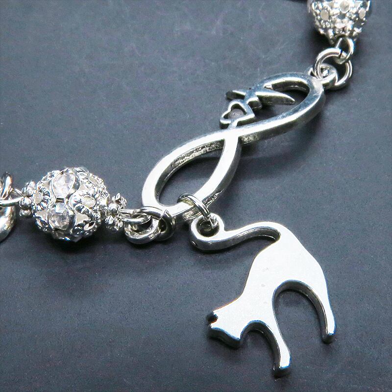 ラインストーン入りのメタルビーズとエターナルモチーフをつなげたチェーンに、跳ね猫のシルエットチャームを吊り下げました