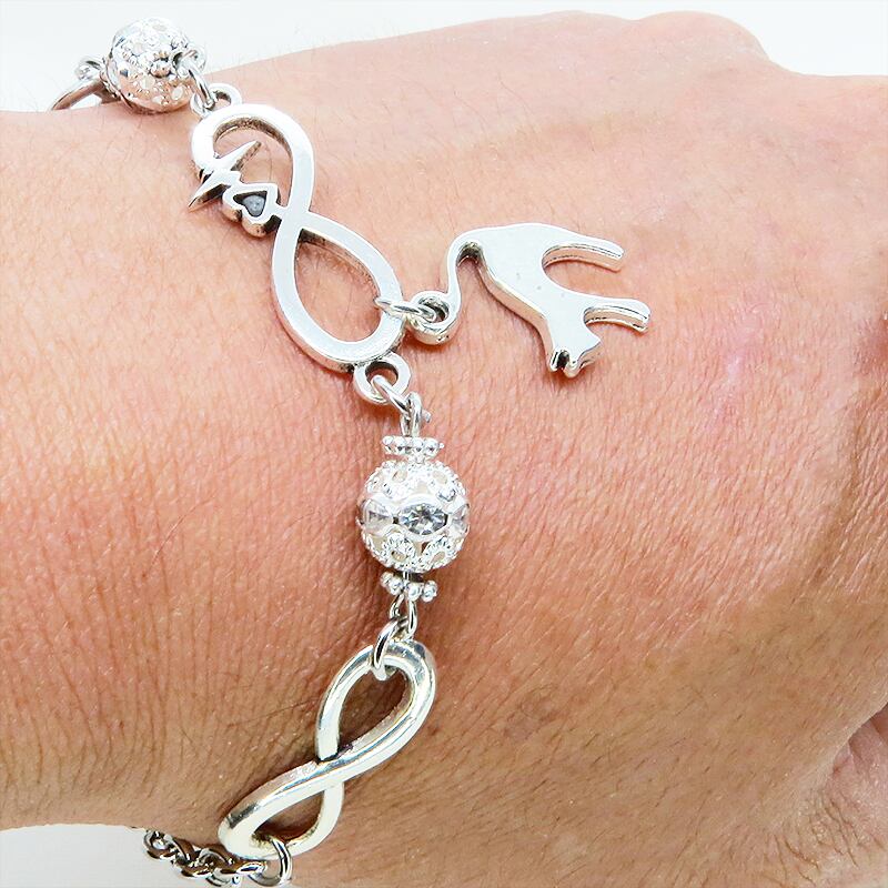 その上部には、ラインストーンが埋め込まれたメタルビーズと、永遠を意味するエターナルモチーフを組み合わせたチェーンが繋がり、手首で優雅に揺れます