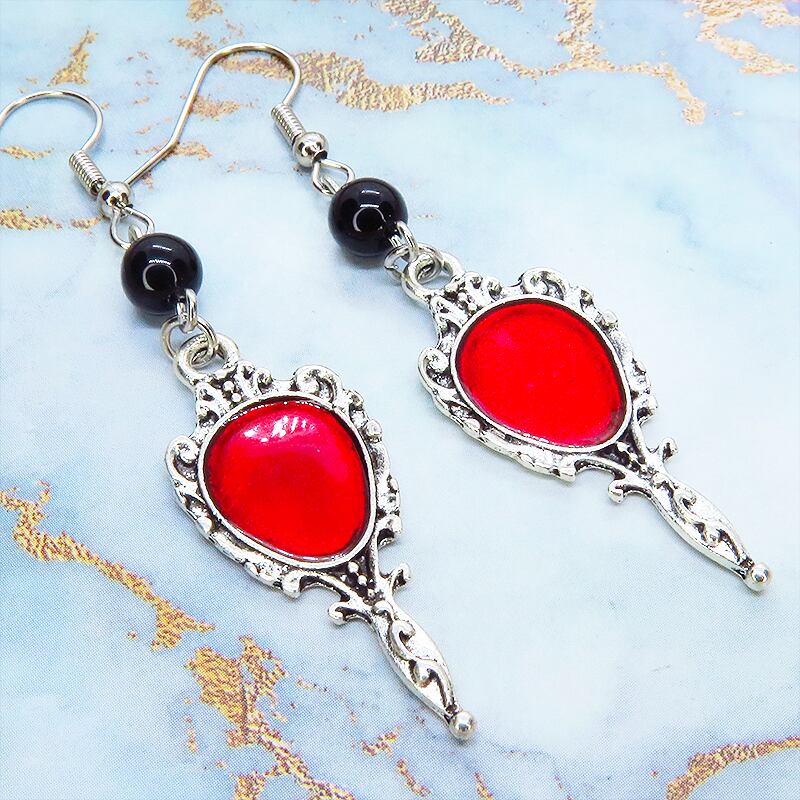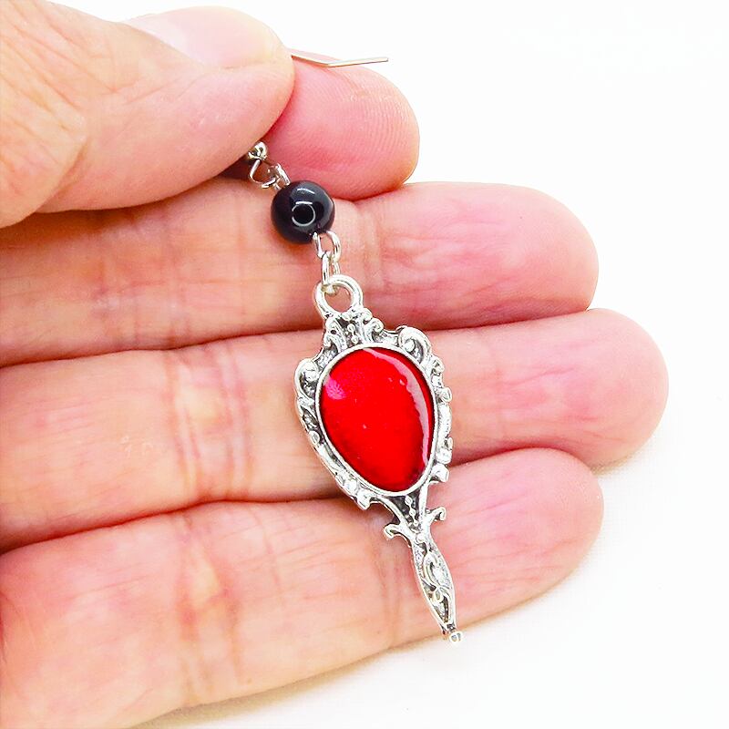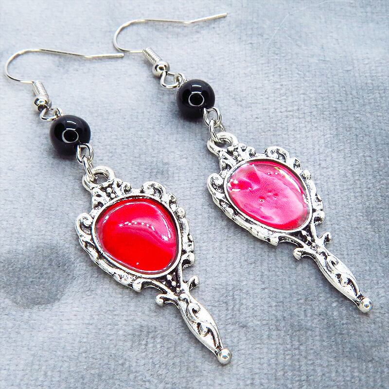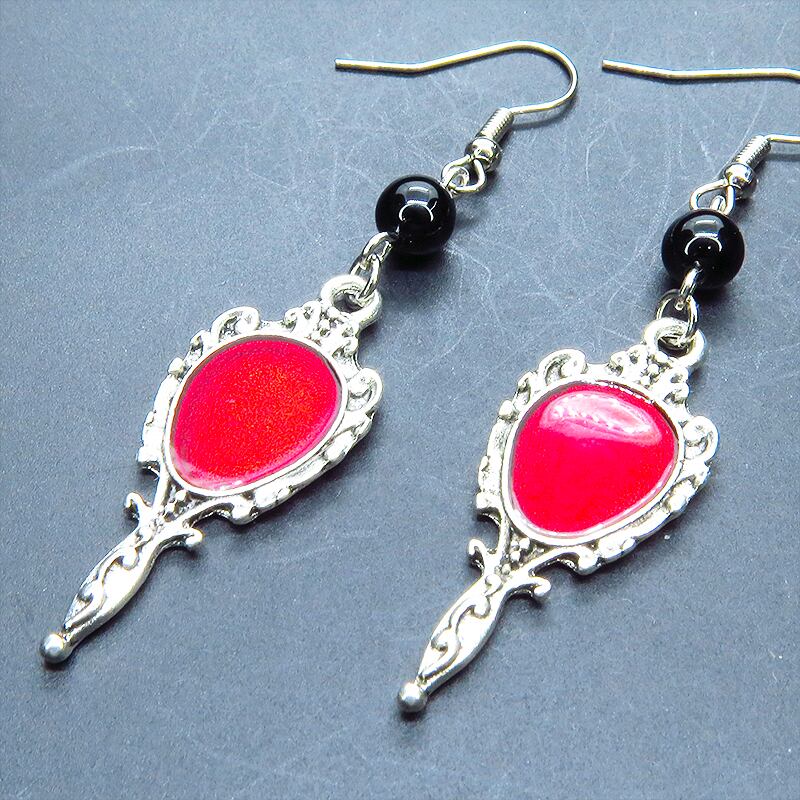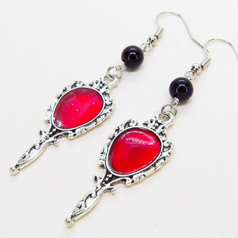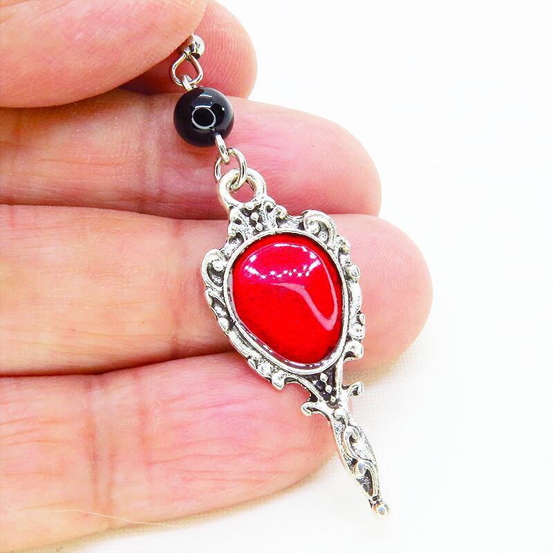 シルバーカラーをベースにスカーレットカラーのエナメルが鮮やかに輝くゴシック調のハンドミラーチャームと、オニキスビーズを組み合わせました