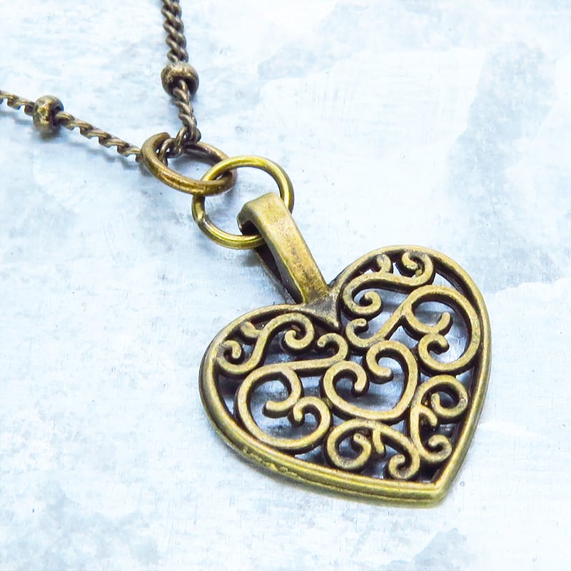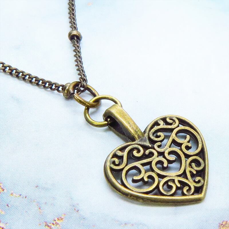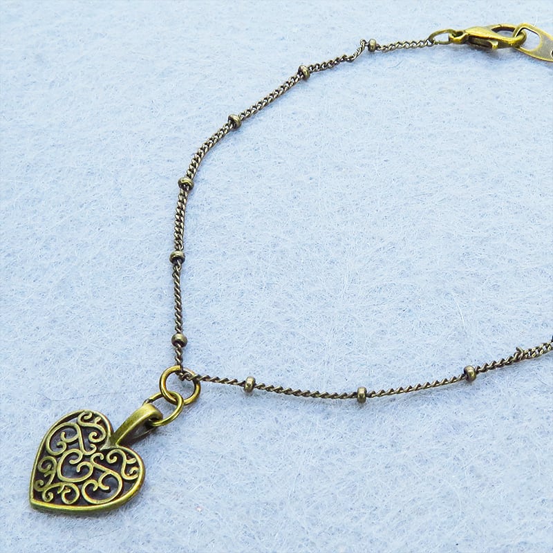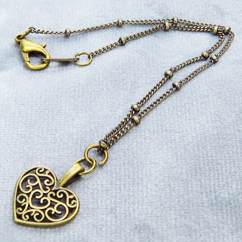 アラベスク調の透かし模様が施されたハートモチーフのチャームをメタルビーズ付きの細めのチェーンに吊り下げました