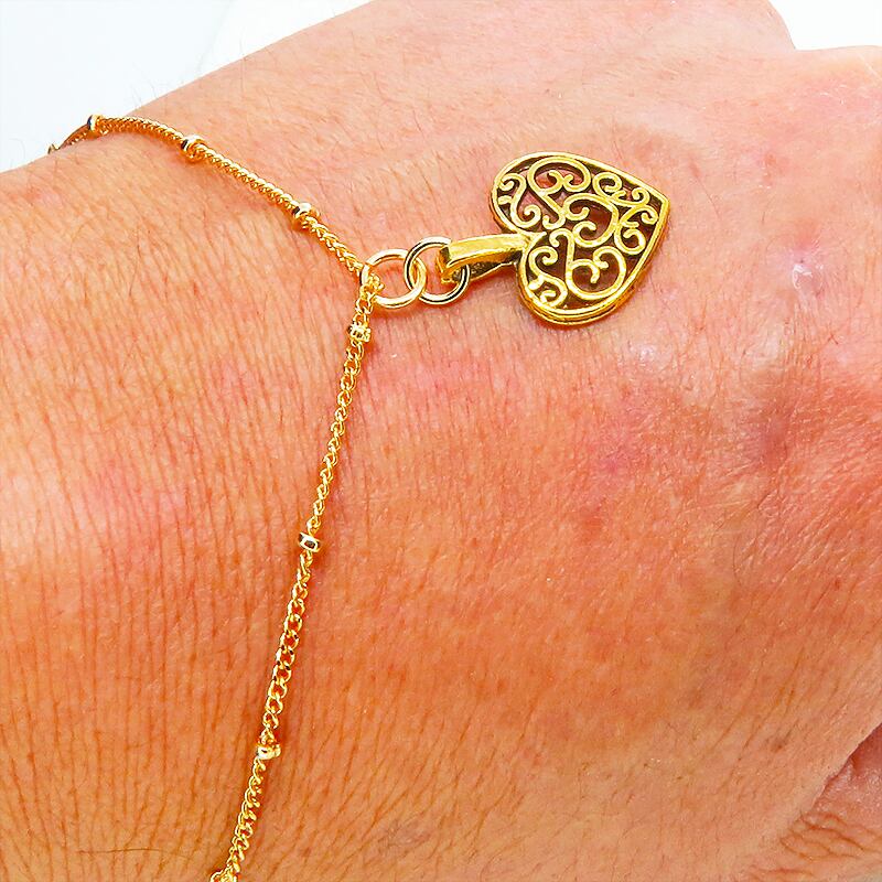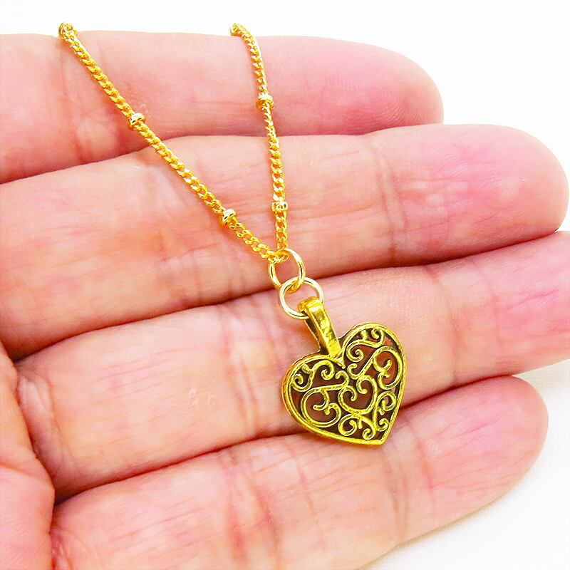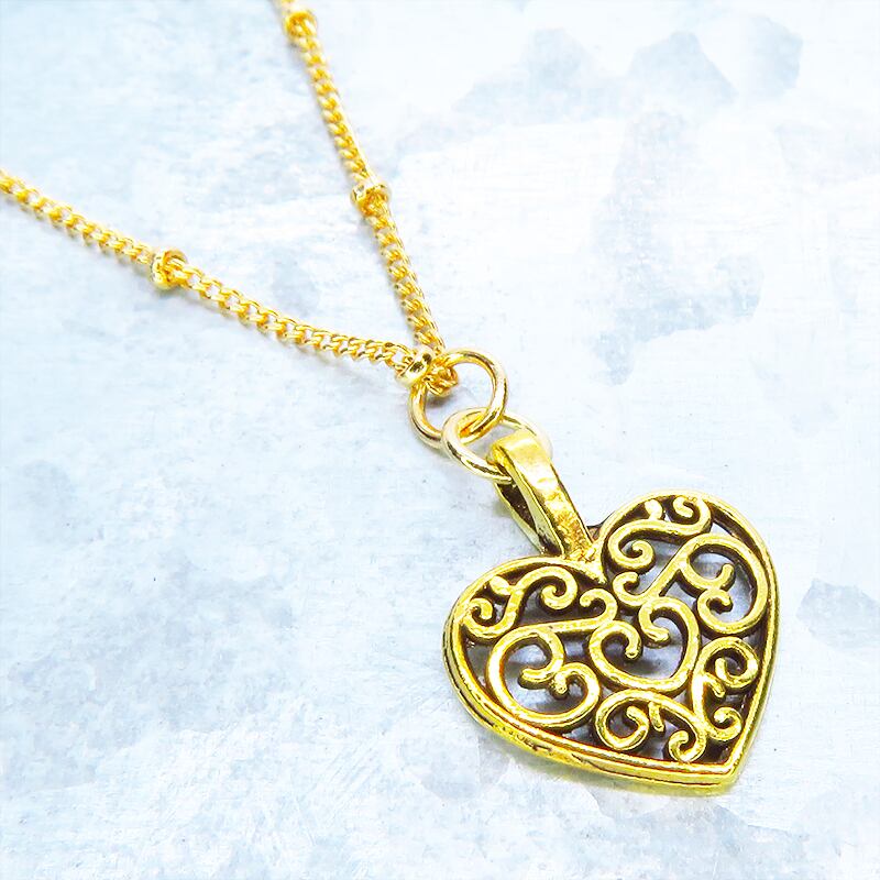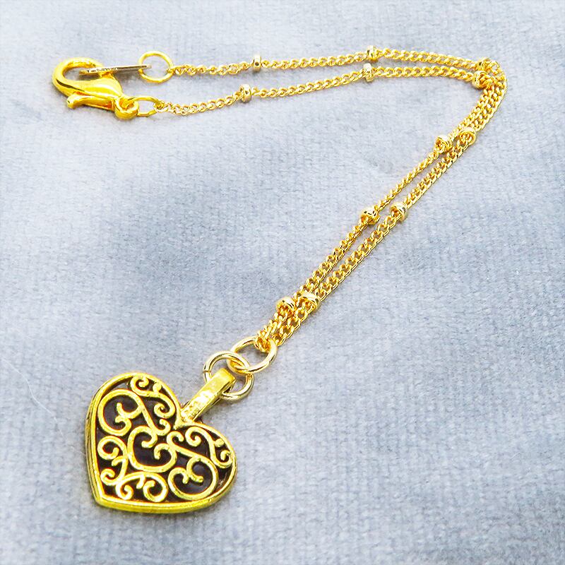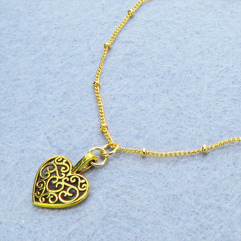 アラベスク調の透かし模様が施されたハートモチーフのチャームをメタルビーズ付きの細めのチェーンに吊り下げました