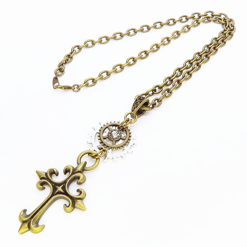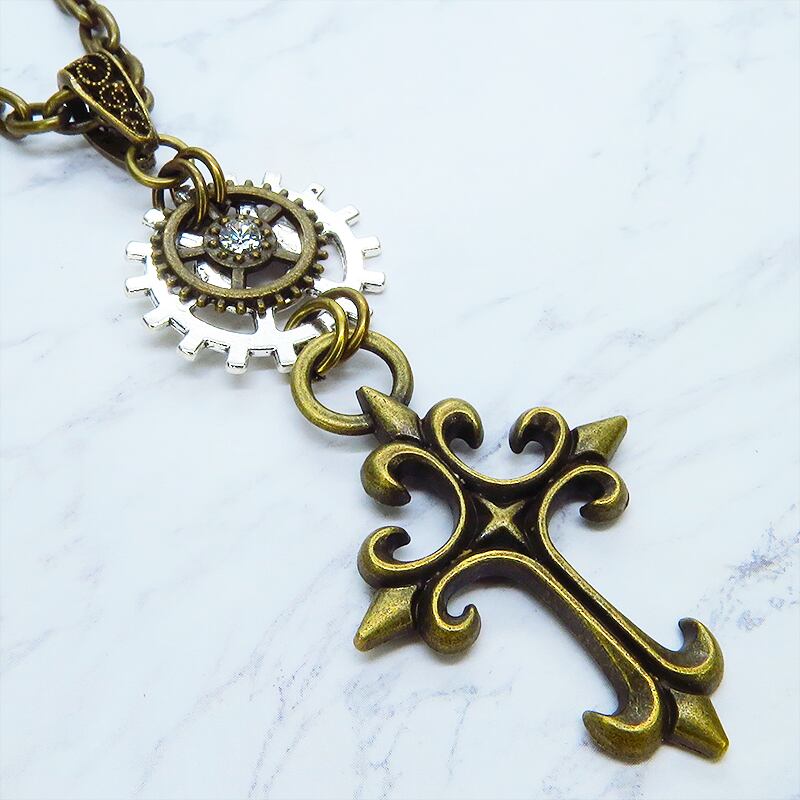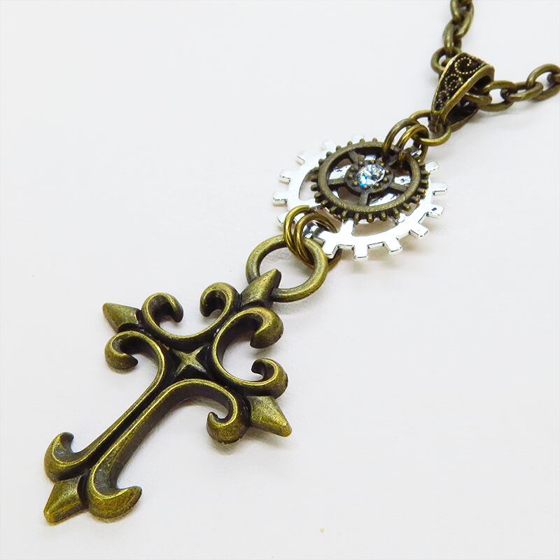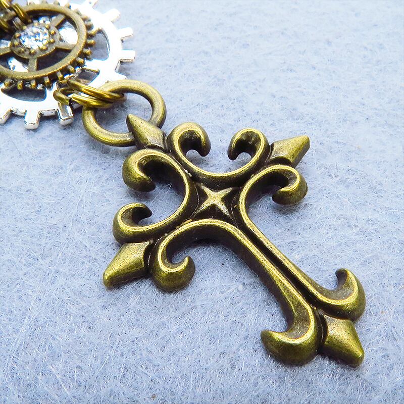 ペンダントヘッドは、ゴシック調の装飾的なロザリオ(クロス)と、精密な歯車の組み合わせ