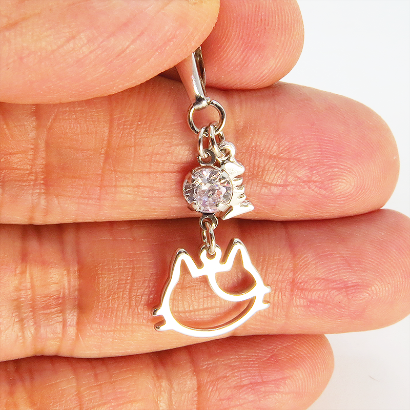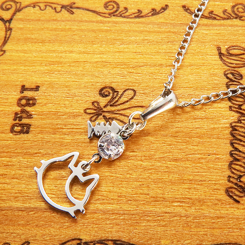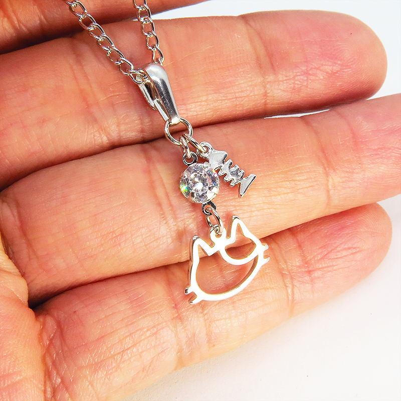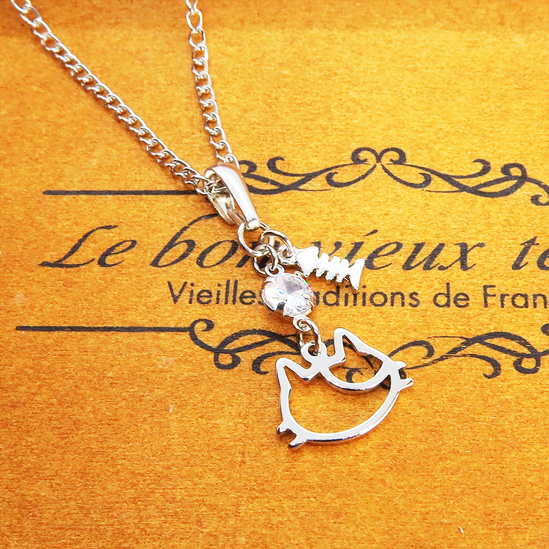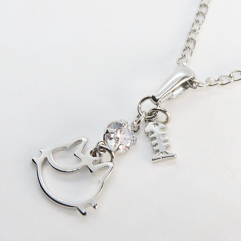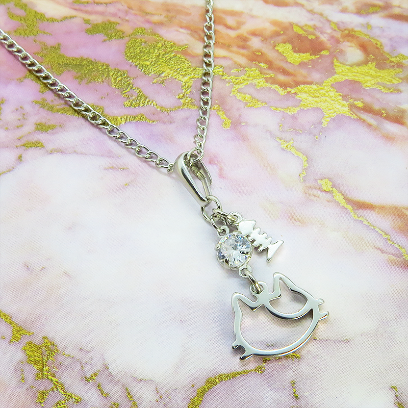 三毛猫の猫フェイスのシルエットモチーフに魚のチャームを添えたコンパクトな可愛いペンダントのネックレスです