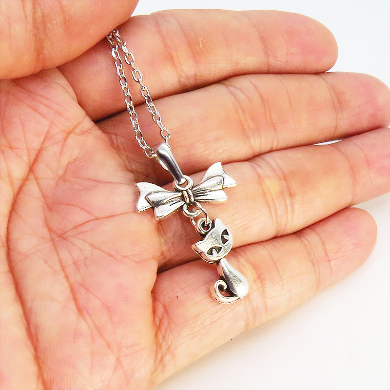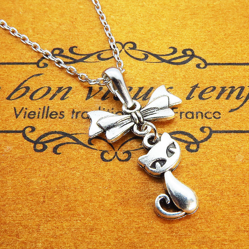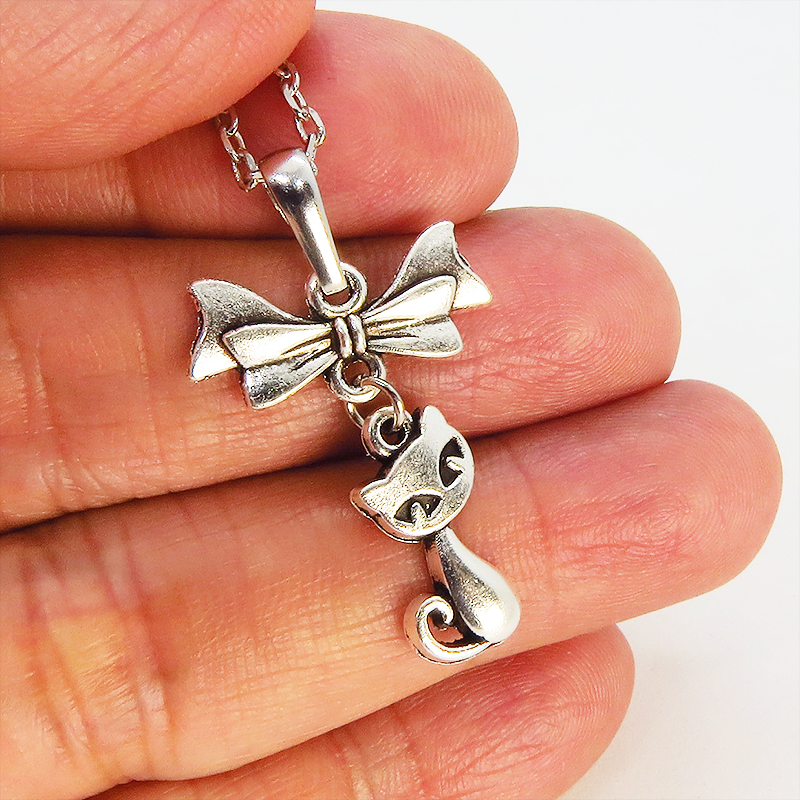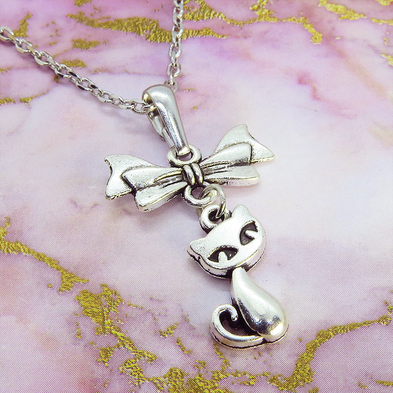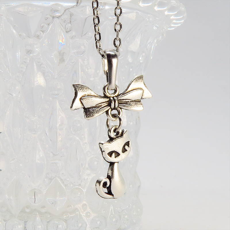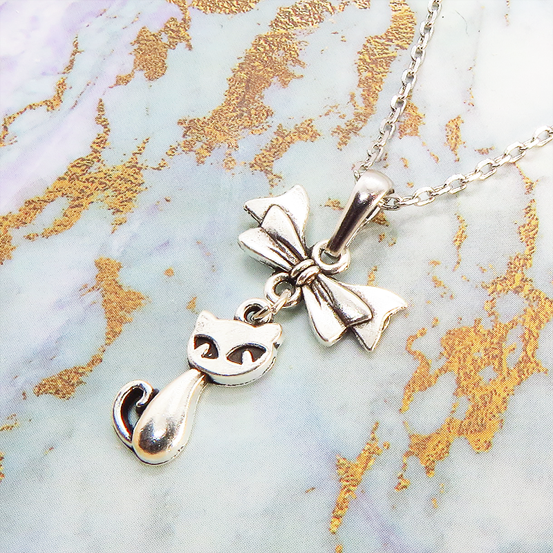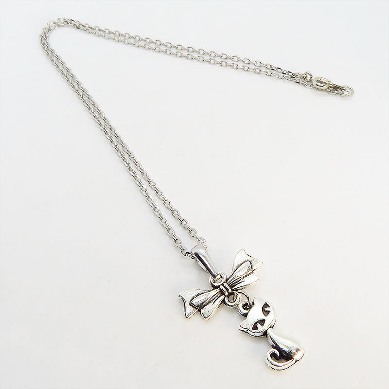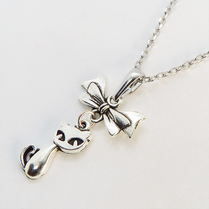 アンティークシルバー(銀古美色)で統一した、猫とリボンのシンプルで可愛いネックレスです