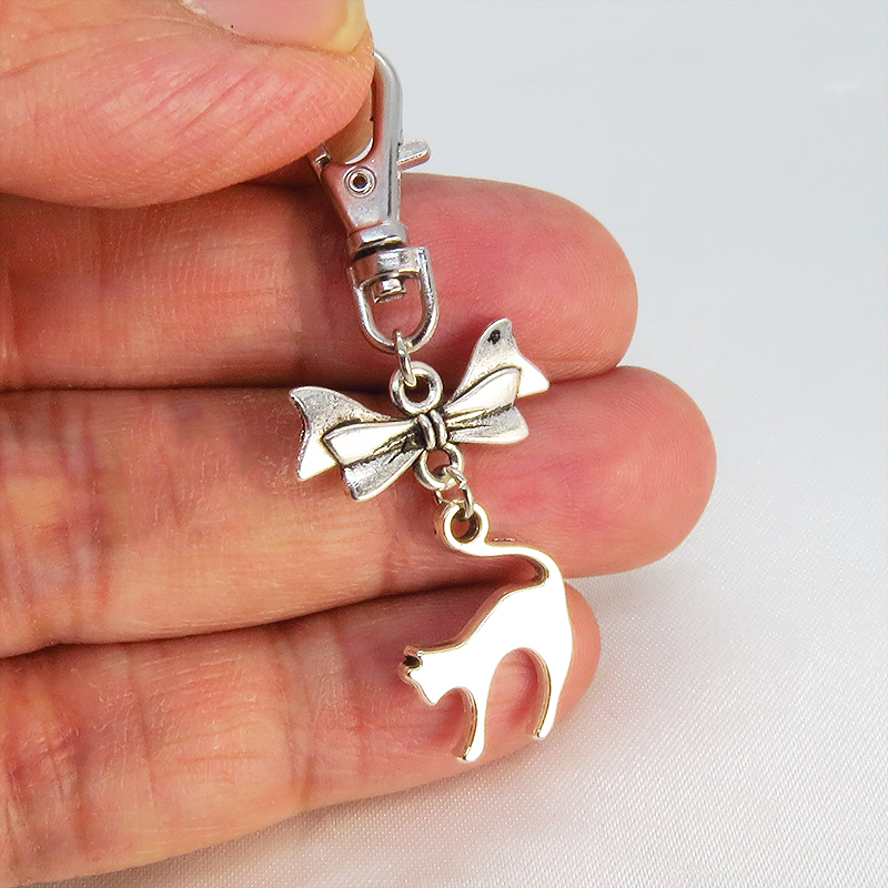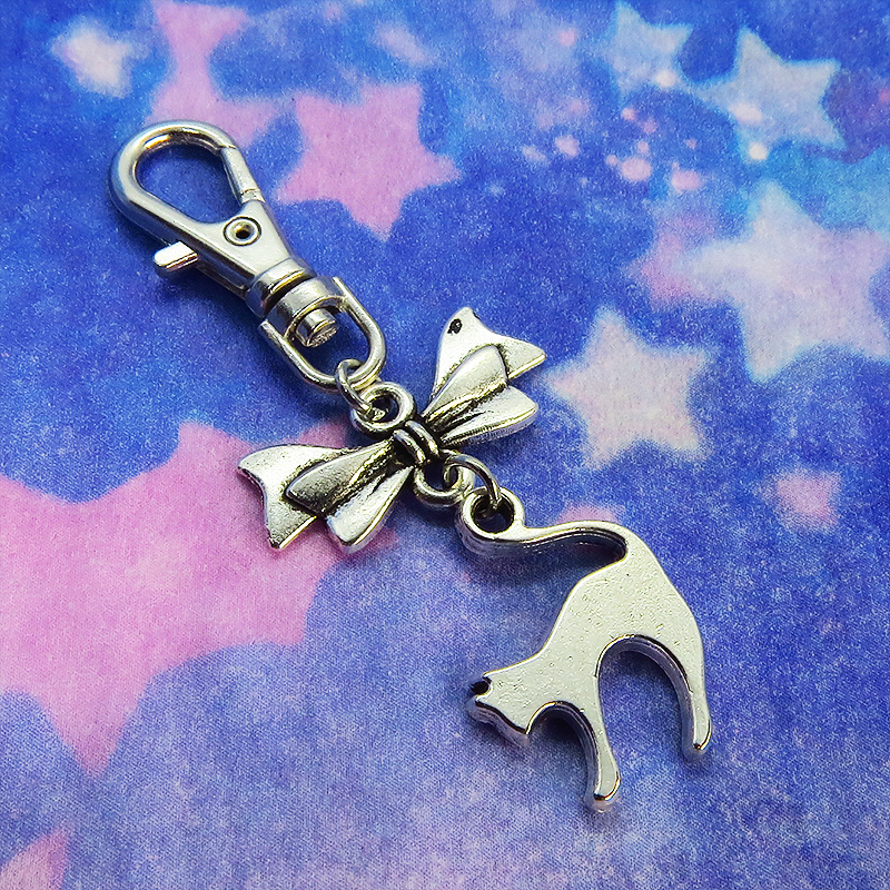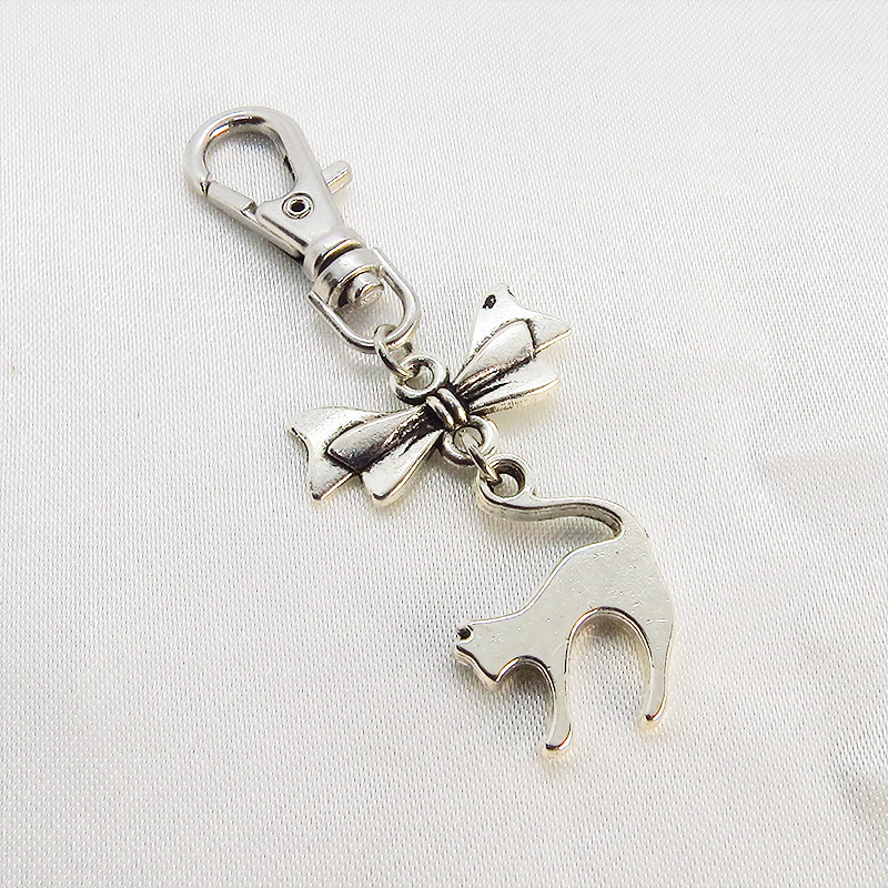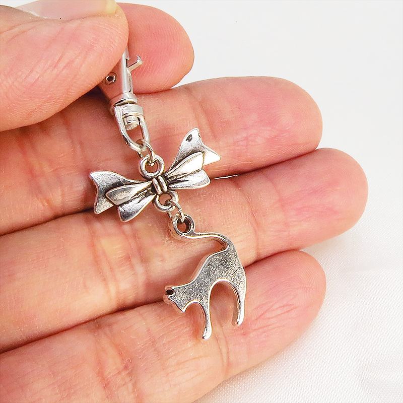 アンティークシルバーのカラーで統一して跳ね猫シルエットとリボンを組み合わせた大人可愛いチャームです