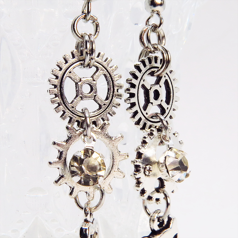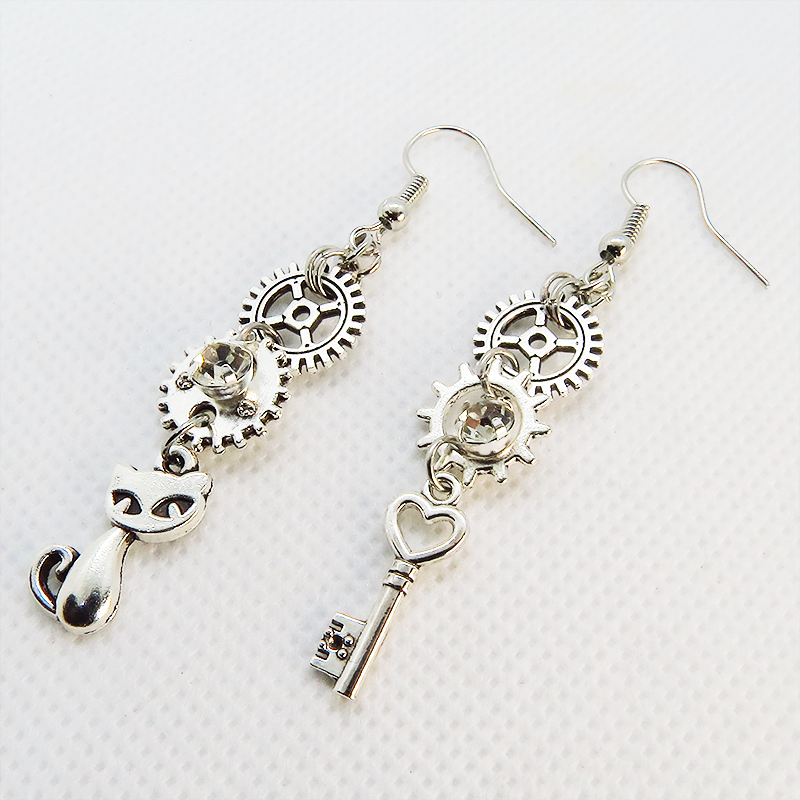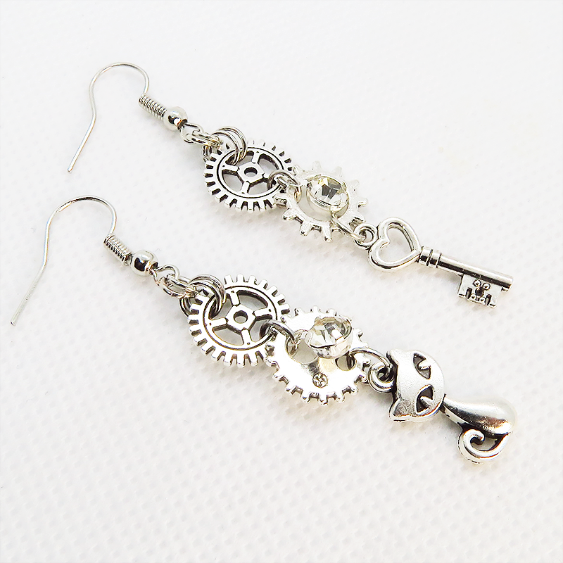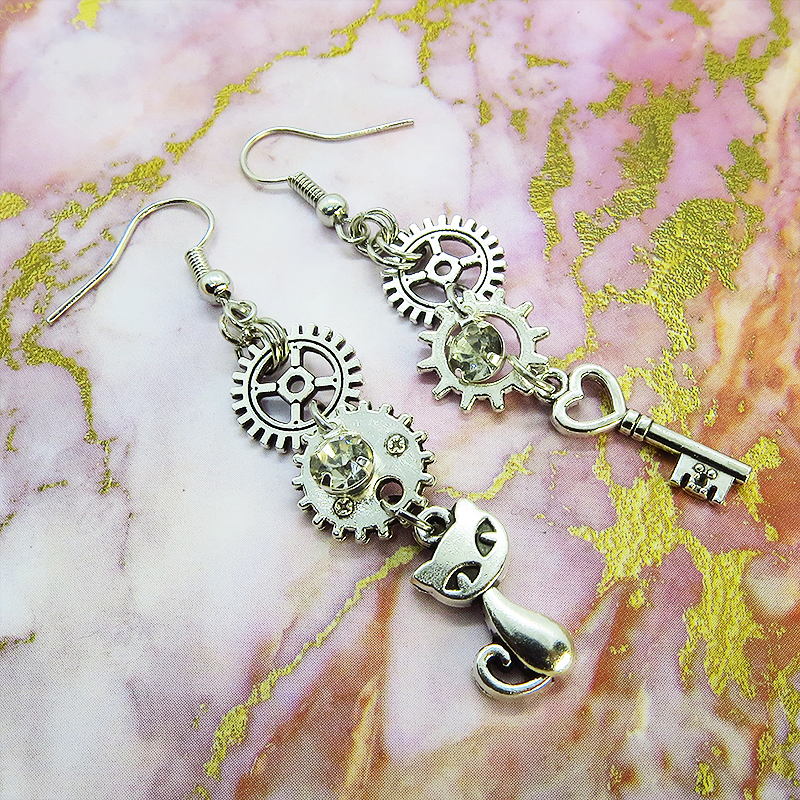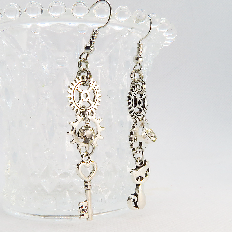 猫と鍵を歯車で組み合わせたコンパクトなスチームパンク風のアシンメトリーピアスです