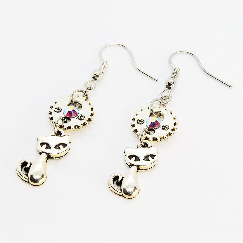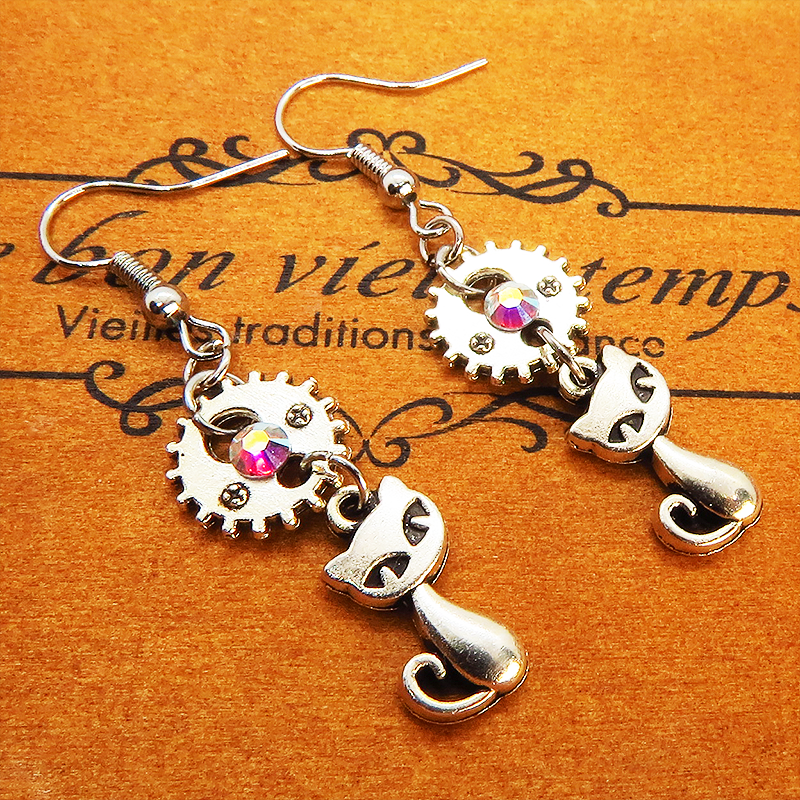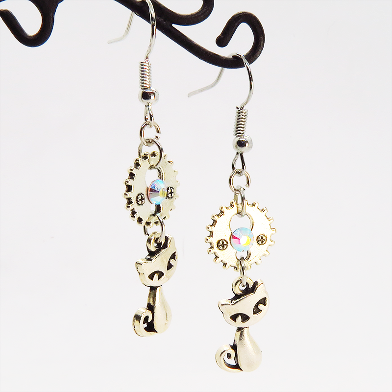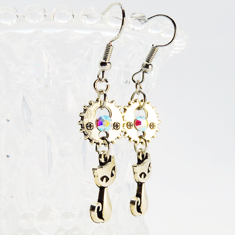 スチームパンク風の猫と歯車・ギアを組み合わせたピアスです