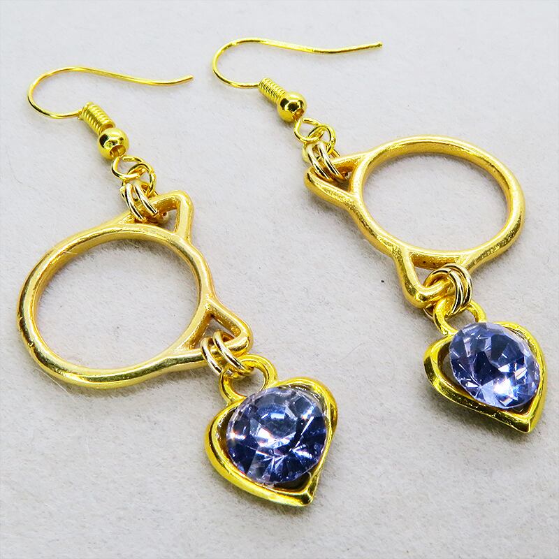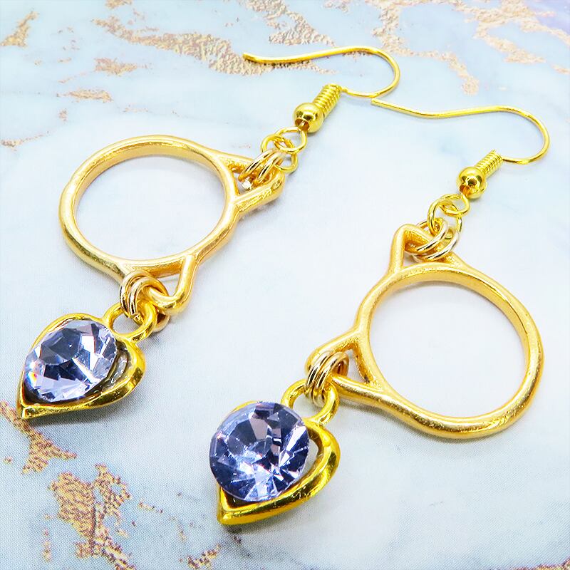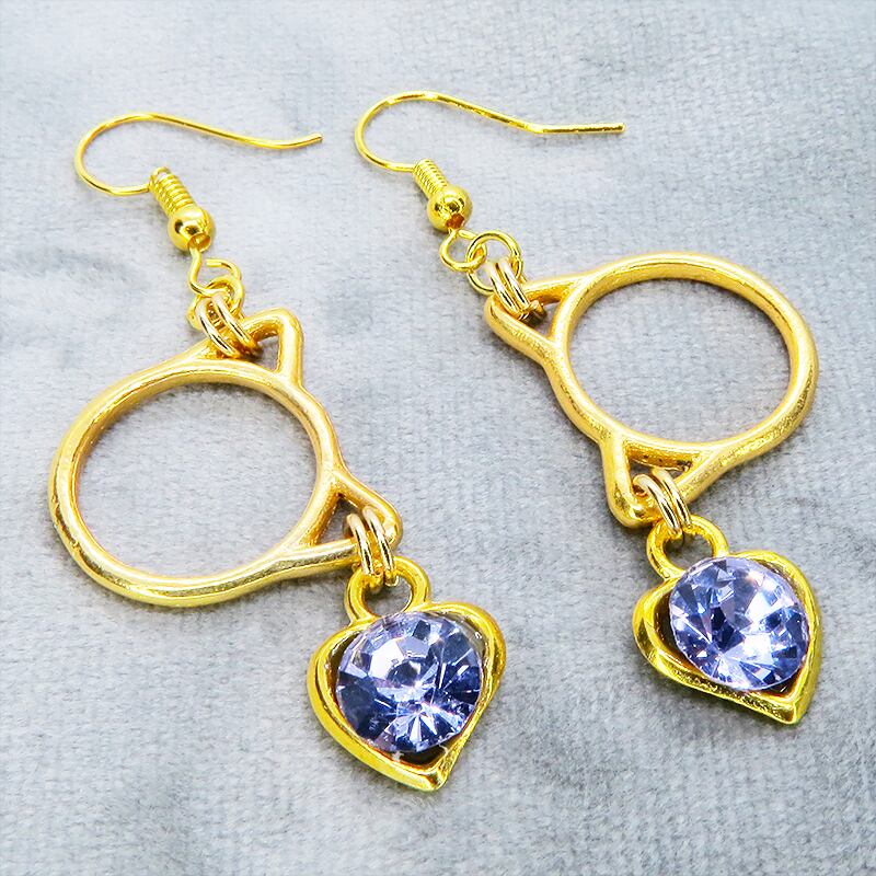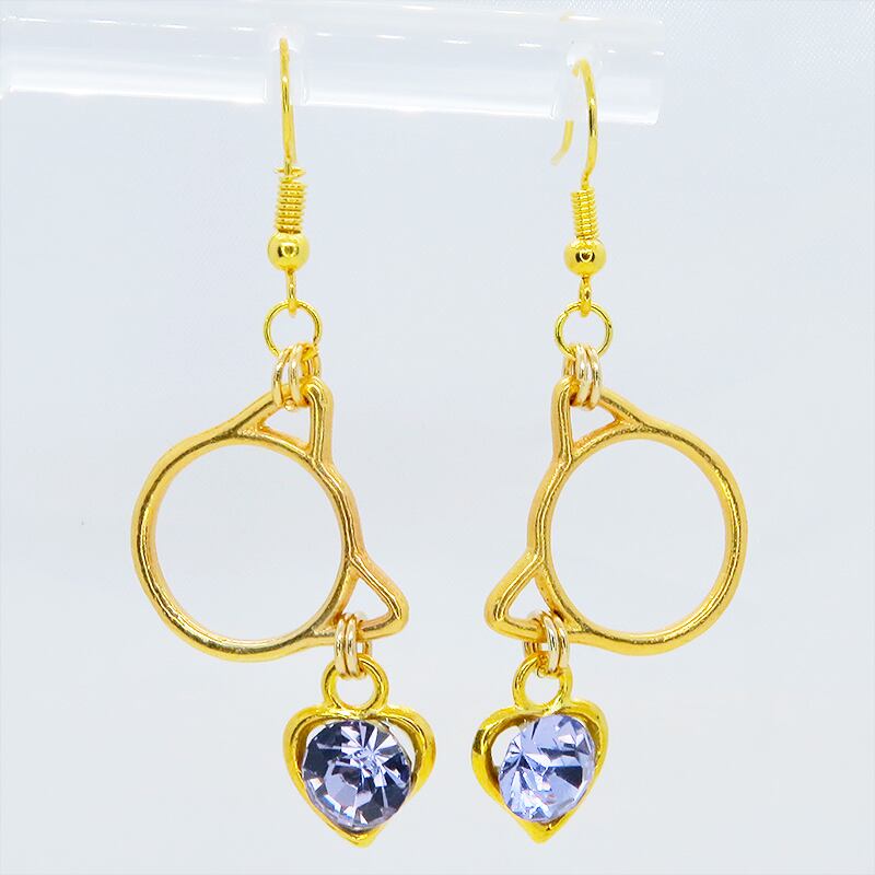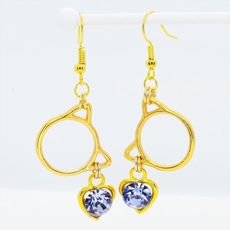 ゴールドカラーの猫のフェイスフレームに、ヴァイオレットカラーのクリスタルガラスを埋め込んだハートモチーフが揺れ、大人可愛いデザインが魅力です